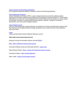 This document lists and provides brief descriptions of several open access LIS journals, including Ariadne, Bulletin of the American Society for Information Science & Technology, The Code4Lib Journal, DESIDOC Journal of Library and Information Technology, DLIB.ORG, E-JASL: The Electronic Journal of Academic and Special Librarianship, Information Research, Issues in Informing Science and Information Technology, Issues in Science & Technology Librarianship, Library Philosophy & Practice, Library Student Journal, and Libres. It also lists several other open access secondary sources for LIS journals.