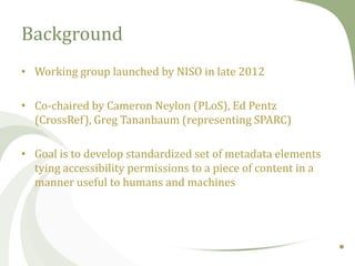The document summarizes the work of the NISO Open Access Metadata and Indicators working group, which aims to develop a standardized set of metadata elements to clearly indicate the accessibility permissions and licensing terms associated with open access content. The working group is co-chaired by representatives from PLoS, CrossRef, and SPARC and involves participants from various organizations. It conducted an information gathering phase and released an initial draft for public comment in January 2014. The draft recommends using XML tags like <free_to_read> and <license_ref> to transmit accessibility and licensing data for open access articles in a way that is useful for both humans and machines. The goal is to reduce confusion about open access rights and permissions as