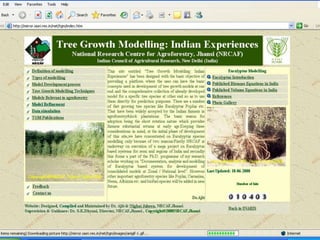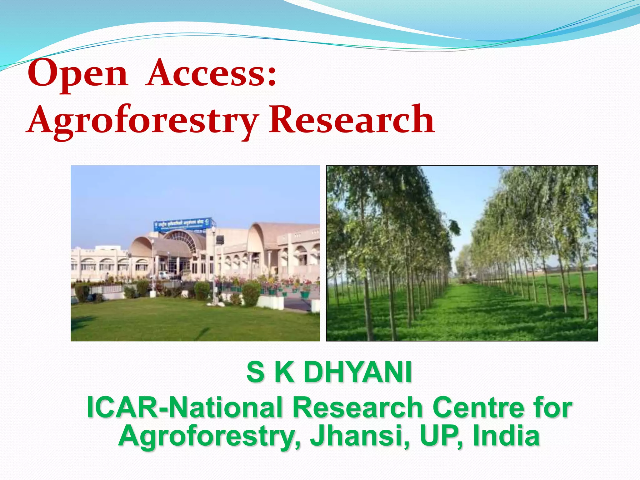 Agroforestry research in India is increasingly being made openly accessible online. The National Research Centre for Agroforestry has developed an Agroforestry Database with information on multipurpose tree species used in agroforestry systems. This includes data on growth, climate requirements, production, and bibliographic references. The World Agroforestry Centre also provides open access to databases and other resources on agroforestry research worldwide. Open access journals on agroforestry and forestry research are also available to allow free sharing of research findings.