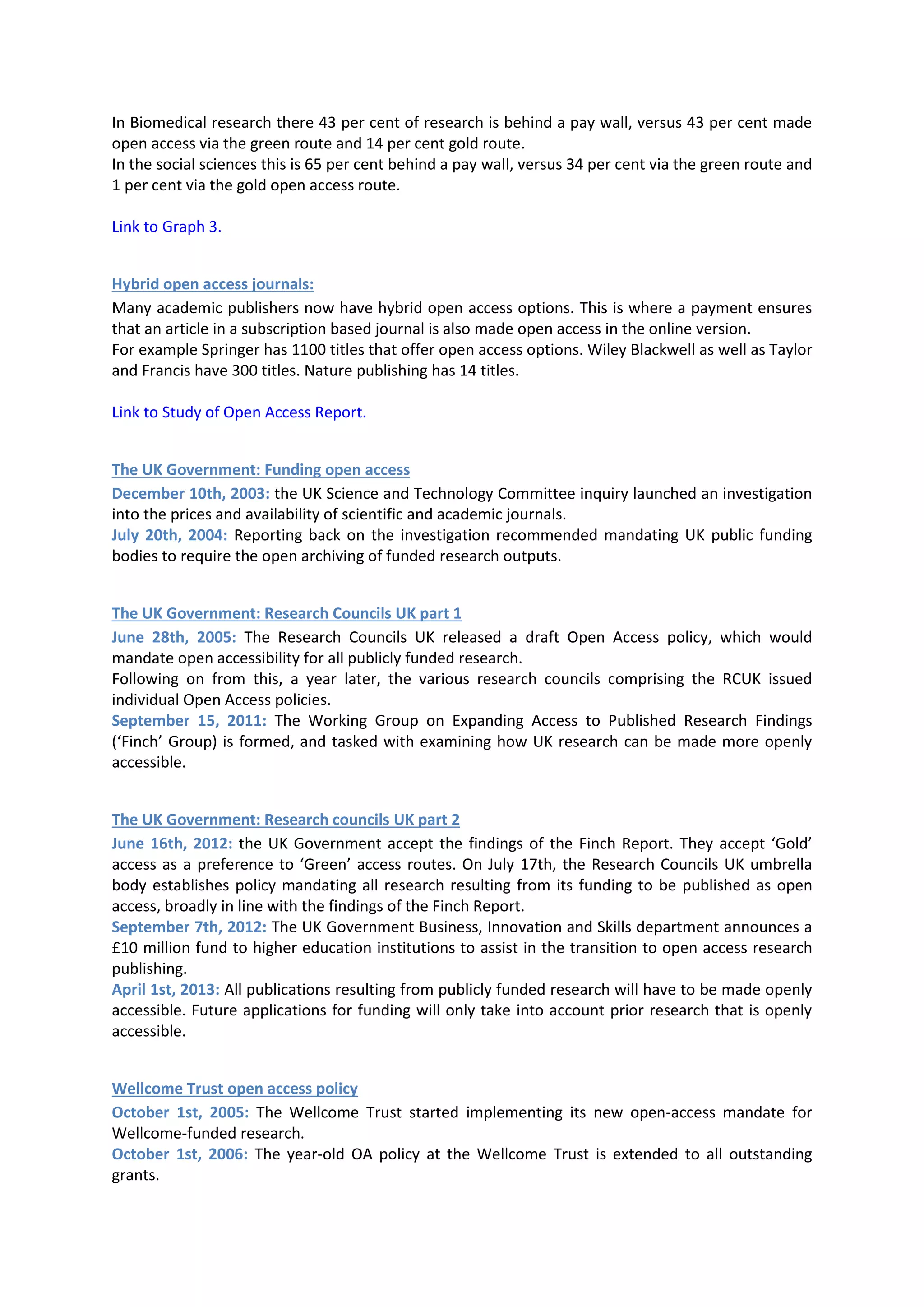 The document provides a history of open access, beginning with the principles of openly sharing ideas and insights. It describes how the internet enabled open access by facilitating information sharing online. Key events that advanced open access as a principle include the 2001 Budapest Open Access Initiative and statements in 2003 supporting open access. Governments and institutions, including the UK and Wellcome Trust, later implemented policies mandating open access to publicly funded research. The document traces the growth of open access publishing and repositories from 1993 to present. It outlines different routes to open access like gold and green and looks at developments in the US, Europe, and future of open access.
