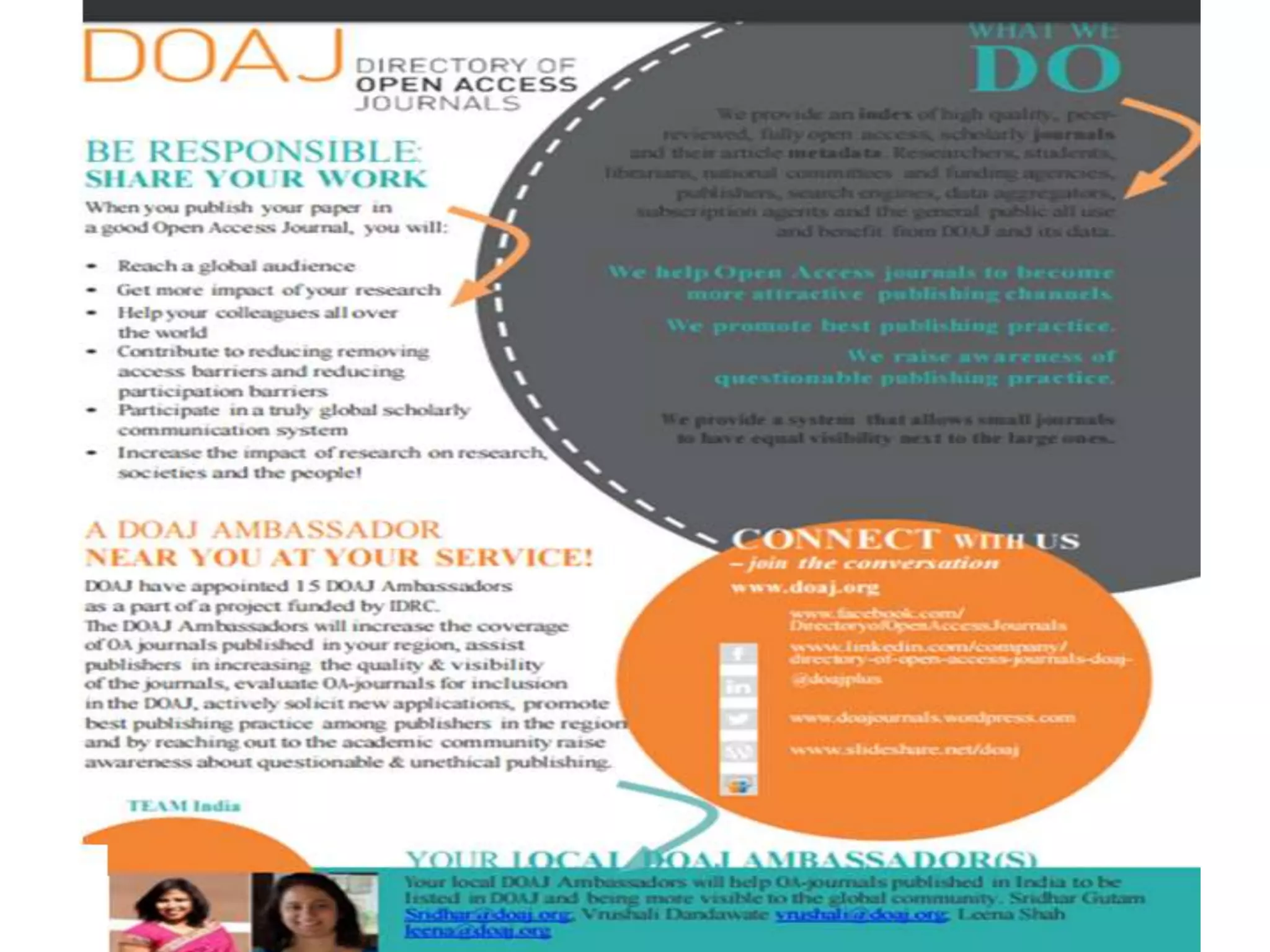 3. It discusses the Directory of Open Access Journals (DOAJ) and its role in increasing the visibility, accessibility, and impact of open access scholarly journals. The DOAJ indexes over 11,000 open access journals across many disciplines.