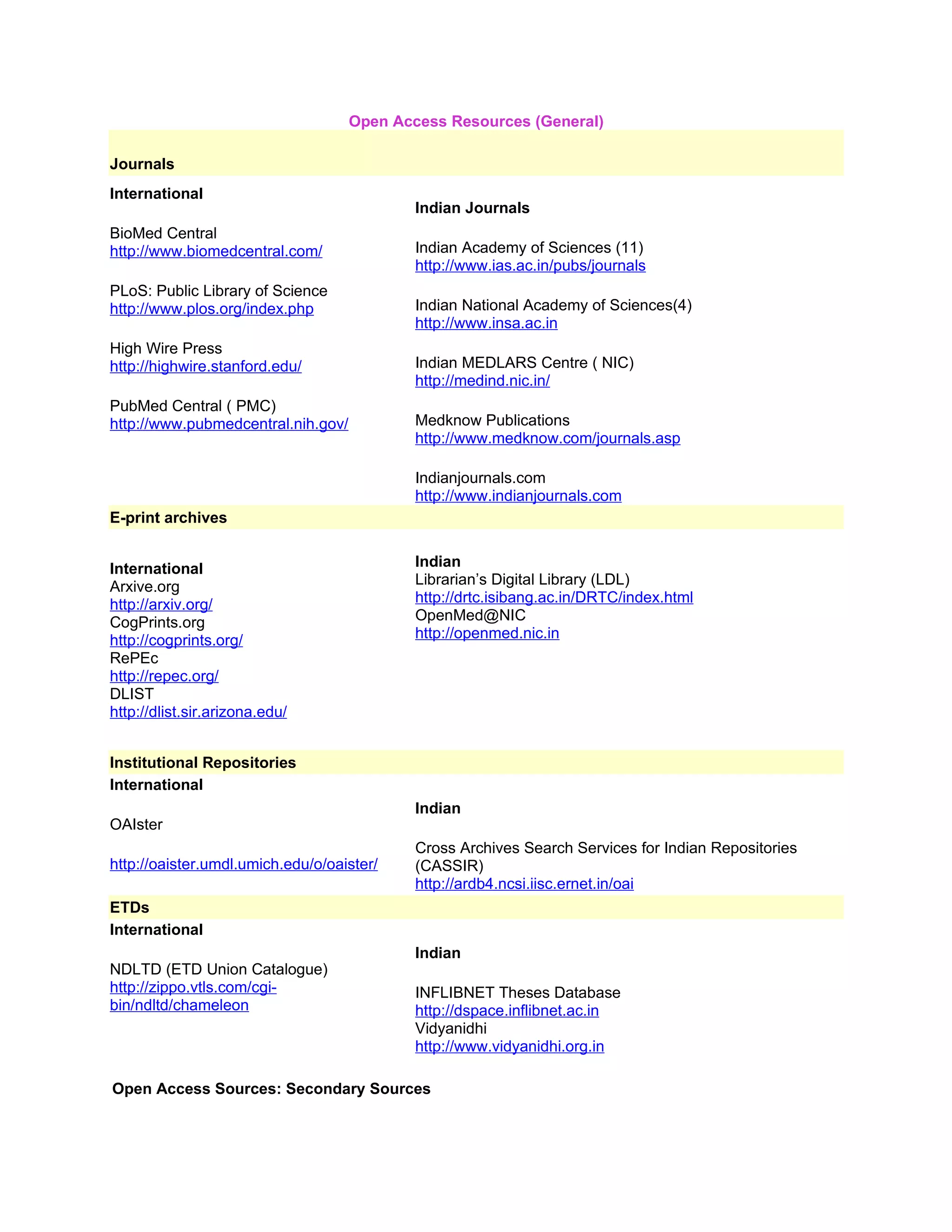This document lists numerous open access resources for journals, e-print archives, institutional repositories, electronic theses and dissertations (ETDs), and secondary sources about open access. It separates international and Indian resources. For journals, it provides links to resources like BioMed Central, PLoS, HighWire Press, and PubMed Central internationally and resources indexing Indian journals. For e-print archives it lists resources like Arxiv and CogPrints internationally and repositories like Librarian's Digital Library and OpenMed in India. It also provides links to international ETD repositories like NDLTD and Indian ones like INFLIBNET and Vidyanidhi. Directories and registries of open access content are also included.