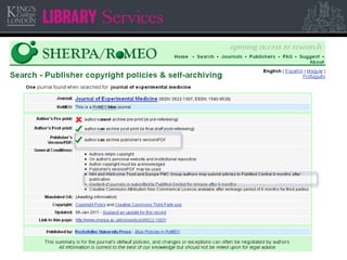 This document summarizes an open access workshop for post-doctoral researchers at IOPPN in October 2014. The workshop covered what open access is, open access publishing options like gold and green open access, funder open access policies from organizations like Wellcome Trust, RCUK, NIHR and HEFCE. It discussed how to find open access content, publisher policies, using the institutional repository and research profiles, sources of funds for open access publishing, and support available from the library. Common questions about open access were answered and final thoughts encouraged developing a statement of intent regarding open practices.