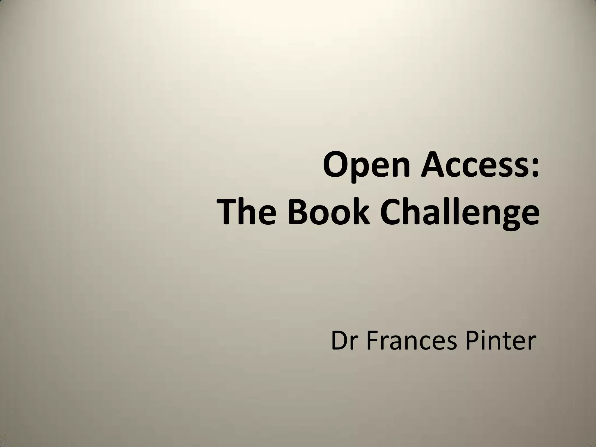 Open Access books are being funded through various experiments including combining open access editions with print/e-book sales, institutional support from organizations like the World Bank and Amherst College, and research funding bodies in countries like the Netherlands, Austria, UK, Germany. Publishers are also implementing author-side publication fees for open access books, and other funding methods include general crowd-funding campaigns and having library consortiums fund books. Additionally, some libraries are collaborating with publishers on open access publishing and engaging in their own library publishing initiatives.