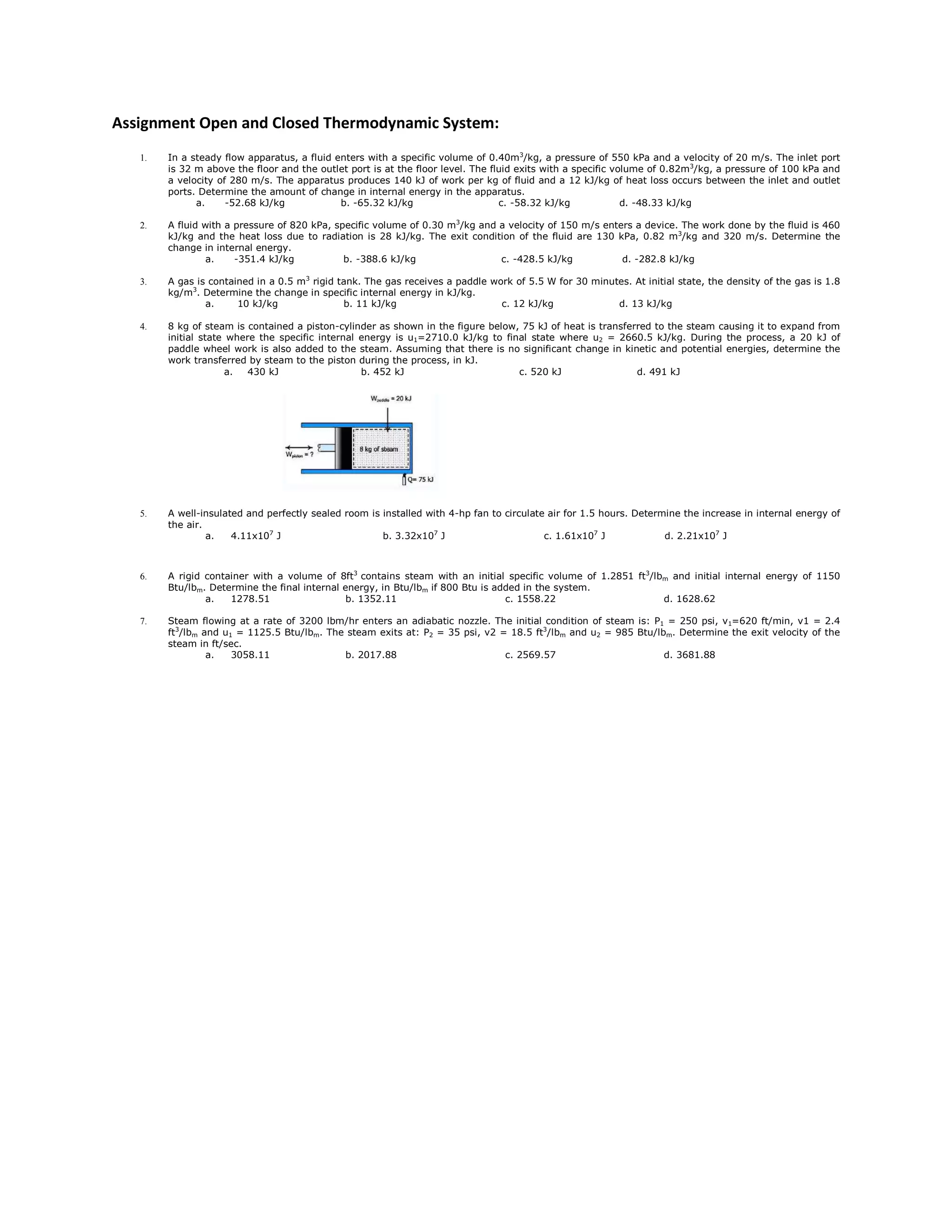 A fluid enters a steady flow apparatus with a specific volume of 0.40 m3/kg, pressure of 550 kPa, and velocity of 20 m/s, and exits with a specific volume of 0.82 m3/kg, pressure of 100 kPa, and velocity of 280 m/s. The apparatus produces 140 kJ of work per kg and experiences 12 kJ/kg of heat loss. The change in internal energy is determined to be -58.32 kJ/kg.