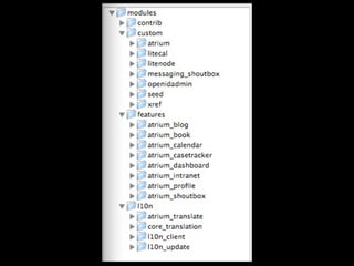 This presentation discusses Open Atrium, an install profile for Drupal that includes commonly used features out of the box. It works with Aegir and does not modify Drupal core or contrib modules. Open Atrium features can be shared and extended by the community. Upcoming improvements to packaging on Drupal.org may change how install profiles and features are distributed across public and private sources using standard tools like Drush and Aegir.