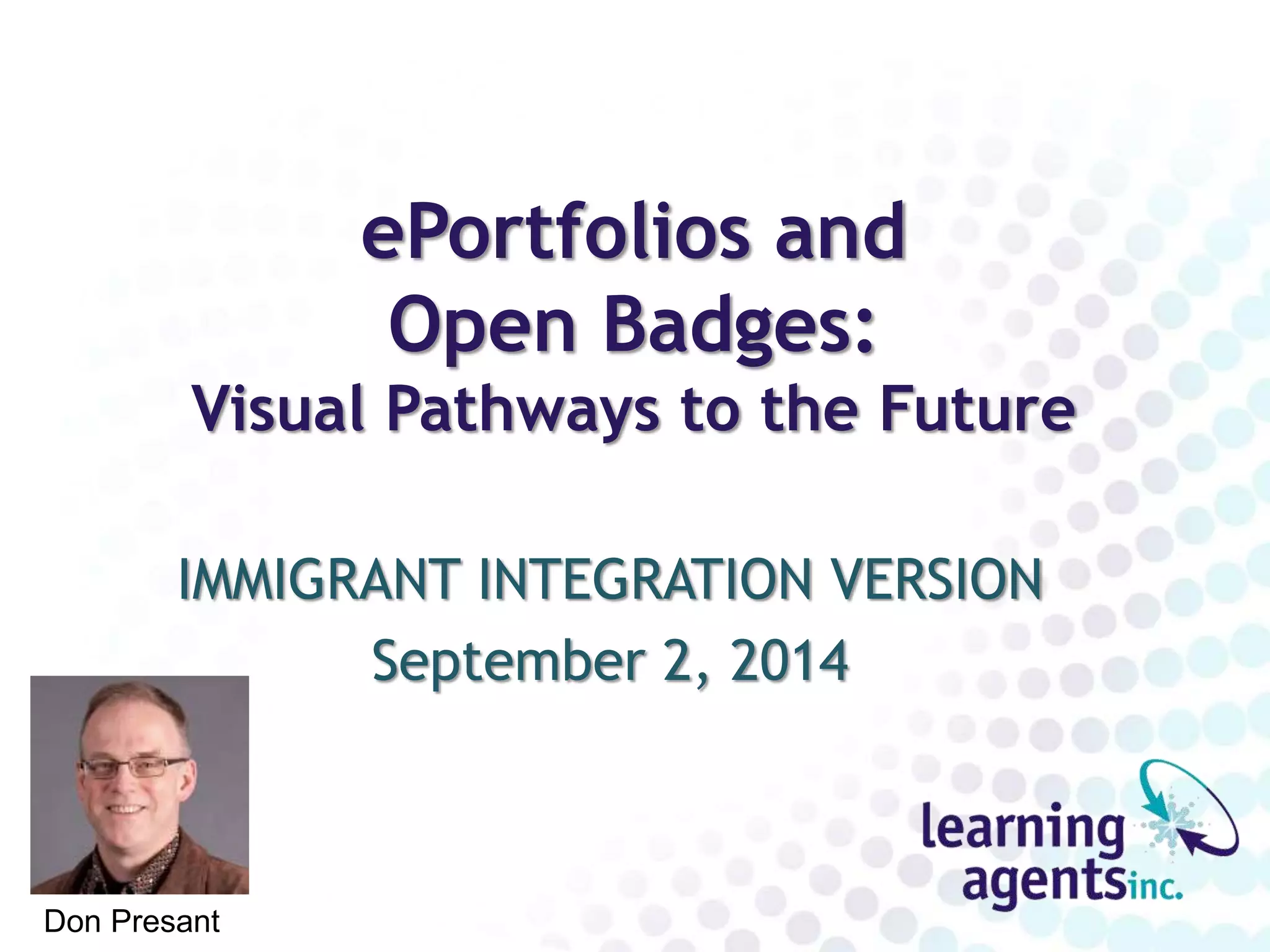 The document discusses the integration of immigrants through ePortfolios and open badges as tools for showcasing learning and skills development. It emphasizes the importance of recognizing prior learning, providing personalized support, and using digital technology to enhance employability. Additionally, it outlines the benefits of gamification and micro-credentialing in fostering engagement and motivation among learners.