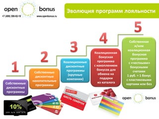 Документ описывает современные инструменты программы лояльности и удержания клиентов, подчеркивая преимущество бонусных систем по сравнению с традиционными скидками. Он акцентирует внимание на том, что бонусные программы могут увеличить клиентскую активность и продажи, а также предлагают методы управления клиентами через интеграцию с CRM. В заключение, документ предлагает анализ эффективности программ лояльности и потенциальные выгоды от их внедрения.