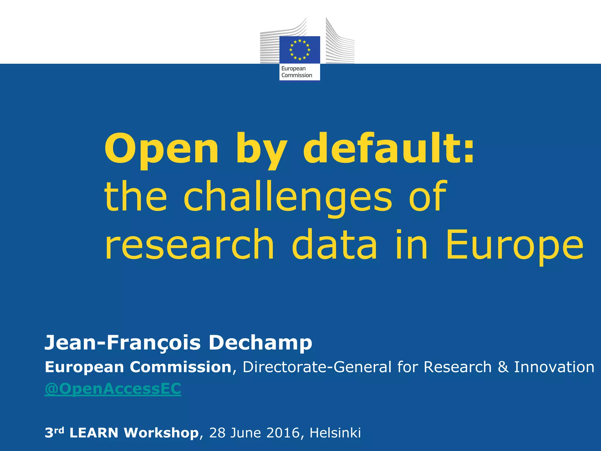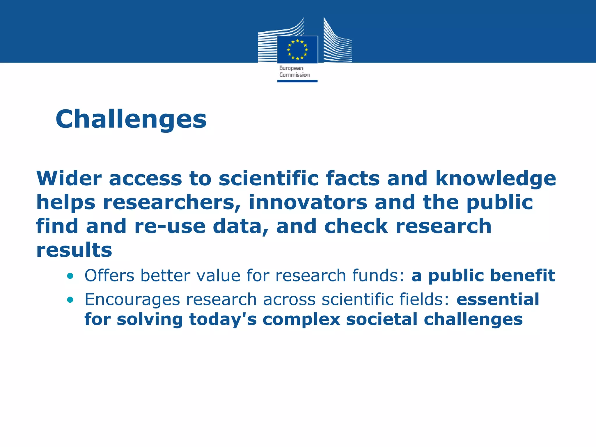 The document discusses the challenges and solutions around open access to research data in Europe. It summarizes that Horizon 2020 now mandates open access to publications and open access to research data by default from 2017. It describes how grantees are required to deposit data in repositories and take measures to grant open access, with the ability to opt-out for certain reasons. The approach has been tested in a Horizon 2020 pilot and will expand in 2017 to cover all areas with the same rules, aiming for research data to be as open as possible while allowing necessary closures.