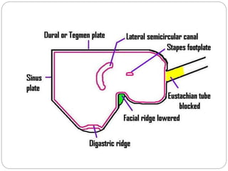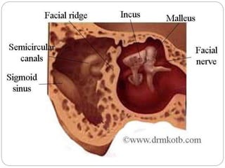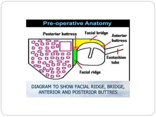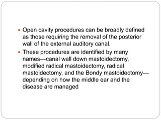 This document discusses open cavity mastoid operations, including their history, indications, techniques, and complications. Open cavity procedures involve removing the posterior wall of the external auditory canal to exteriorize the mastoid cavity. They allow for monitoring of recurrent cholesteatoma and drainage for unresectable infections. The radical and modified radical mastoidectomies developed historically to fully remove bone-invading disease while preserving hearing when possible. Key steps involve identifying and preserving the facial nerve while removing disease-affected areas. Postoperative care focuses on re-epithelialization of the cavity and monitoring for complications like infection, nerve injury, and recurrent cholesteatoma.