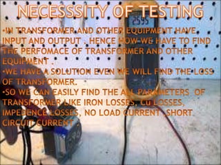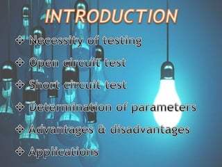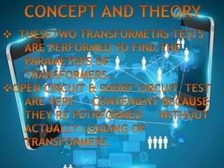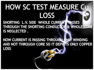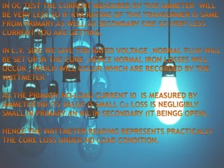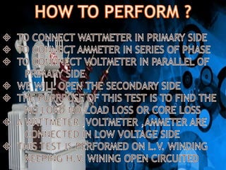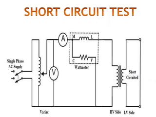 This document discusses how to perform open circuit and short circuit tests on a transformer to determine its equivalent circuit parameters and efficiency at various loads. Open circuit tests are done to measure no-load losses, while short circuit tests measure full-load losses. These tests allow you to calculate the transformer's resistance, reactance, regulation, and efficiency without fully loading it. However, they are not economical for large transformers and do not provide information about different types of losses under various load conditions.