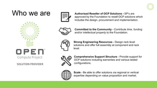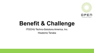 ITOCHU Techno-Solutions America, Inc. promotes the benefits of open compute project (OCP) solutions, including their commitment to the OCP community, strong engineering resources, and comprehensive support. They are an authorized reseller of OCP solutions and can offer regional or vertical expertise depending on customer needs. Some challenges of adopting OCP include choices around resources and costs, but its ecosystem of standardized parts provides benefits like easier operations, transparency, and efficiency. OCP solutions also allow for innovation while ensuring reliability.