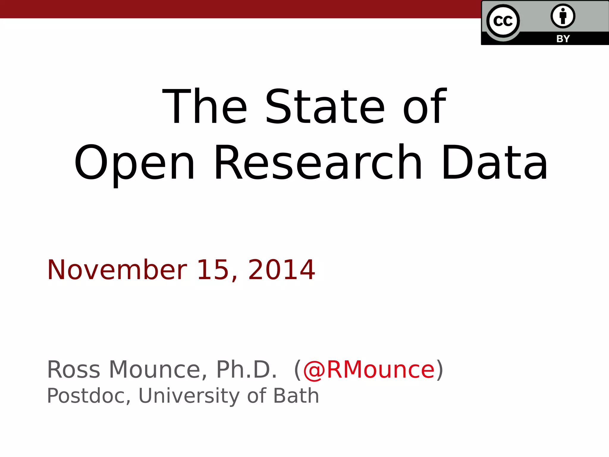This document summarizes the state of open research data by outlining its evolution over time. It begins with centralized data centers in the 1960s and progresses to more collaborative models of data sharing through community agreements and online supplementary materials. The benefits of open data are discussed, including increased reproducibility and citation advantages for authors who share. While open data is ideal, achieving 3-star open standards according to the 5 star scheme is currently realistic. The future may bring stricter funding and publishing requirements to encourage more widespread data sharing.