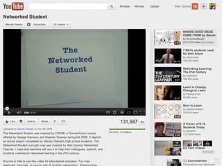 This document discusses how networks and new technologies are changing learning. It notes that knowledge is now abundant and free online, learning is increasingly social and visible, and networks enable new forms of collaboration. Weak ties and open sharing of ideas can spark innovation. The document provides examples of how YouTube, social media, and memes spread information and new literacies like network literacy are important. It emphasizes making the learning process visible and contributing to others' learning through open sharing.
