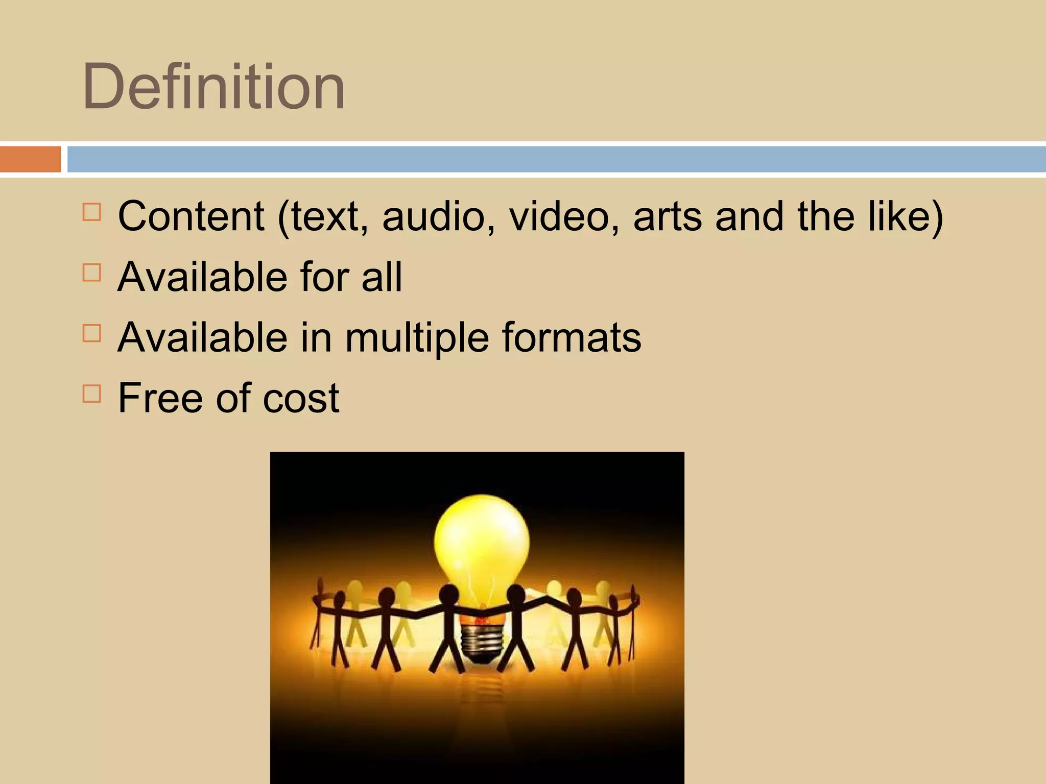 The document defines open content as content that is available freely online for anyone to use, share and modify. Open content can be reused verbatim, revised by translating or adapting it, remixed by combining it with other materials, or redistributed by sharing copies. Examples of open content include educational resources on sites like MIT OpenCourseWare, Khan Academy videos, and Wikipedia articles. The document advocates for using open content in education to provide high-quality, up-to-date learning materials for all students while engaging in the emerging "global revolution" in open teaching and learning.