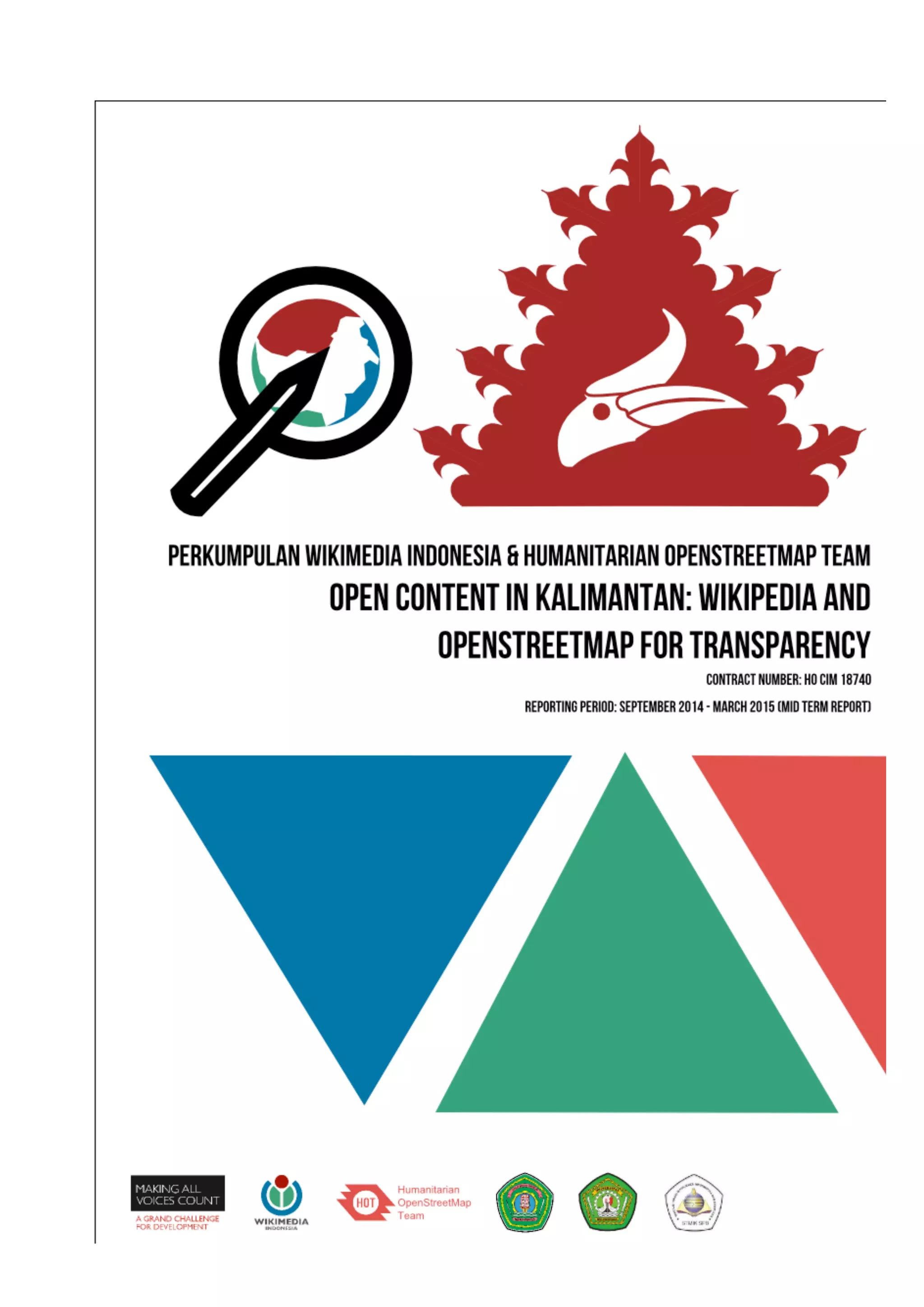 The document outlines a partnership project between Wikimedia Indonesia and Humanitarian OpenStreetMap to enhance map and content accessibility in Indonesia, specifically Kalimantan, through local training and toolkits. The project, funded in 2014, aims to empower local communities to create their own mapping data and Wikipedia content in Indonesian, improving transparency and access to public infrastructure information. The mid-term report highlights achievements, challenges, and outcomes from initial training sessions and community engagement efforts, as well as the ongoing development of instructional tools and software.