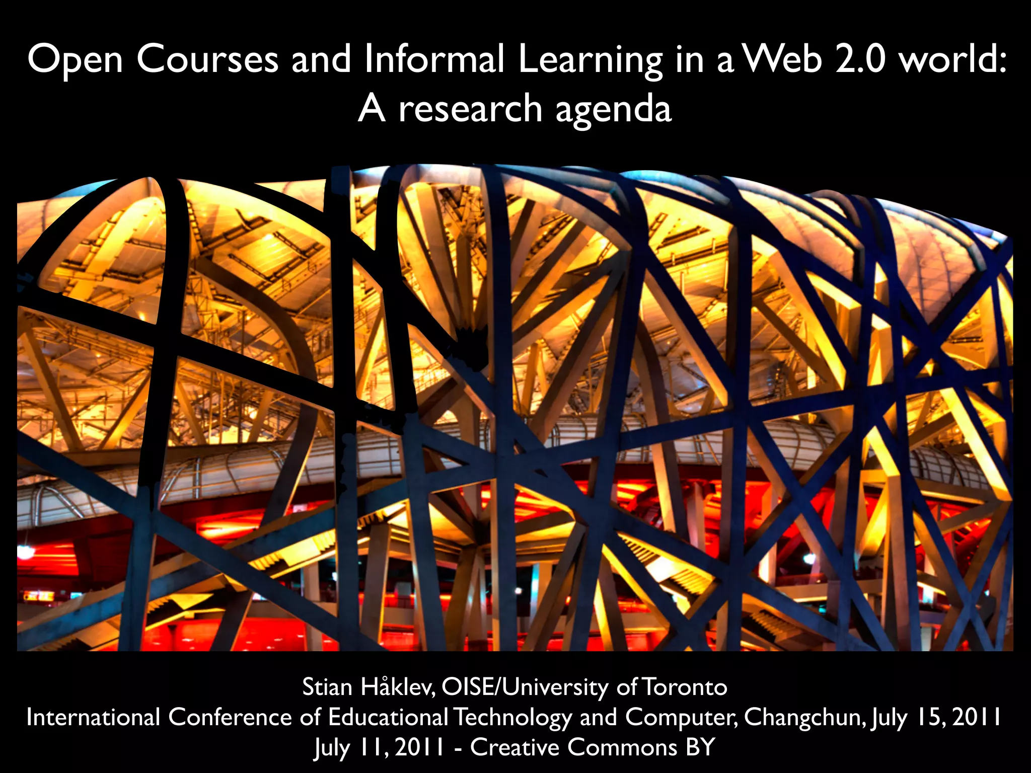 This document discusses open courses and informal learning in a Web 2.0 world. It outlines several research questions about how self-learners use open educational resources to learn and how their learning can be supported. Specifically, it examines issues related to the production and formats of open resources as well as how learners participate in site-specific and topic-based online communities. The document also analyzes dimensions of course "openness" and models of open course design, including the stimulus-response model versus the divergence-convergence cycle model. Finally, it proposes additional research questions about hybrid open/for-credit courses, self-learners' needs, recognition of learning, and communication across different levels of learning.