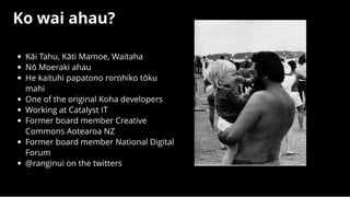 This document discusses open data and issues around data sovereignty. It notes that open data is data that can be freely used and shared, subject to attribution. However, it also discusses problems that can arise from open data, such as inaccurate or flawed data being open, and marginalized groups having their data "colonized" and used against them. It advocates analyzing open data issues through a power differential lens, with those in power being more open and those without power having more control over their own data. The document also lists some organizations working on data sovereignty and indigenous data governance.