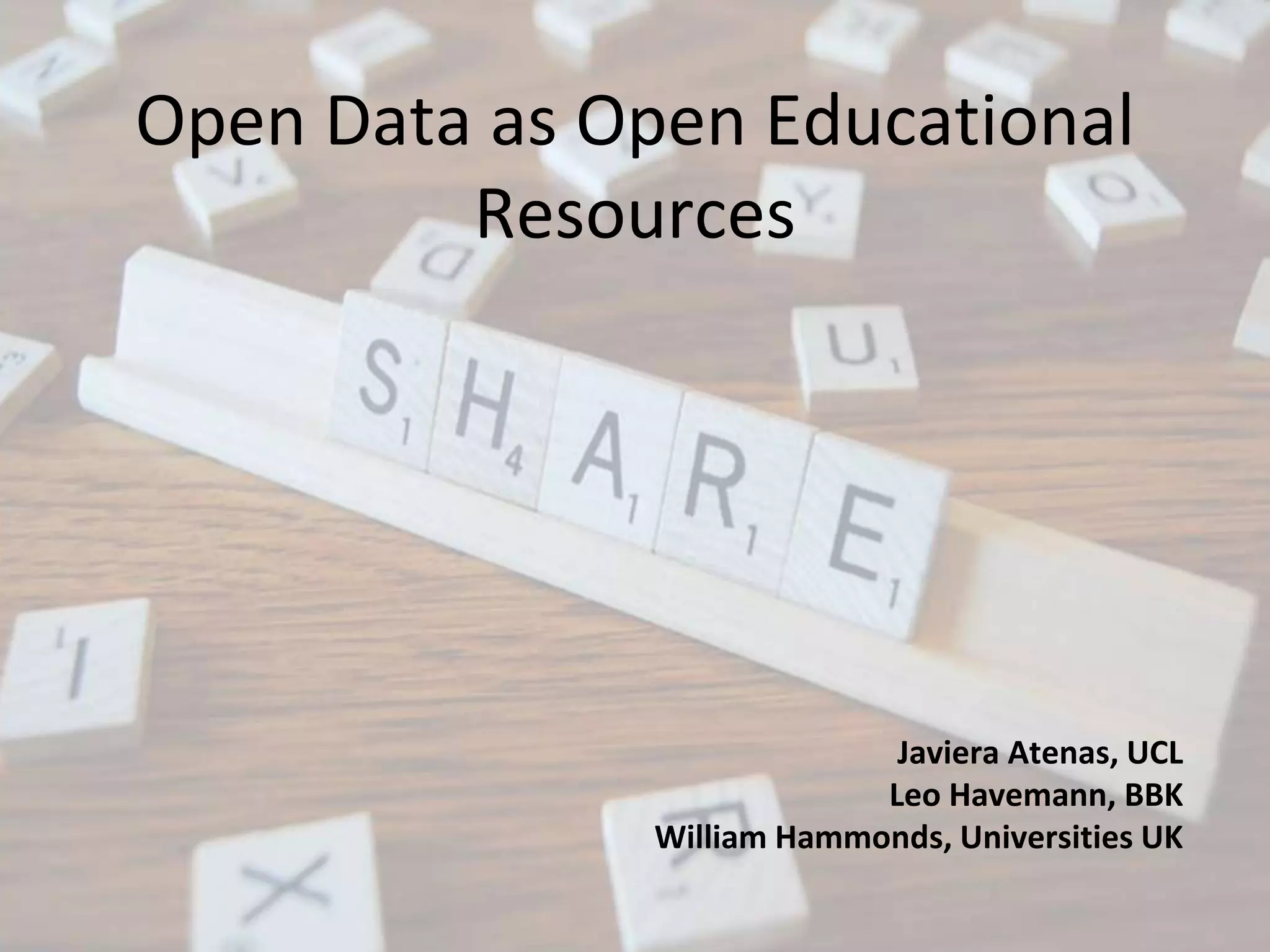 The document discusses open data as an open educational resource in higher education. It outlines how open data from various sources can be used to support transparent research practices, scientific development, and reproducibility. Open data provides opportunities for students to collaborate on real research projects, work on scenario-based learning activities, and collaborate with their local communities on real problems. This helps develop students' critical thinking, analytical, research, data literacy, teamwork, and citizenship skills. The document questions how academics are integrating open data into their curriculum and how students are benefiting from collaborating and developing skills through open data in the classroom.