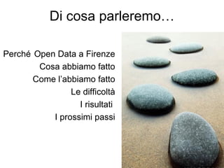 Il documento descrive l'esperienza di Firenze nell'ambito degli open data, evidenziando le attività svolte dal 2003 al 2012, comprese le difficoltà e i risultati ottenuti. Sono stati pubblicati 186 dataset con un alto numero di accessi al portale open data, indicando un crescente interesse della comunità. Vengono anche delineati i prossimi passi e le aspirazioni future per migliorare l'infrastruttura e l'accesso ai dati.