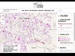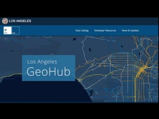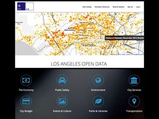 This document discusses how open data is changing Los Angeles. It outlines that open data benefits many industries including financial services, healthcare, communications, energy, charities, government, retail, insurance, manufacturing and technology. It also notes that open data in Los Angeles is being used by governments, developers, businesses, customers, suppliers, journalists and researchers. The document describes Los Angeles' open data governance strategy which includes opening data in useful ways, empowering citizens to use data, hosting hackathons and partnerships, building flexible infrastructure, developing analytics programs, and participating in open data initiatives.
