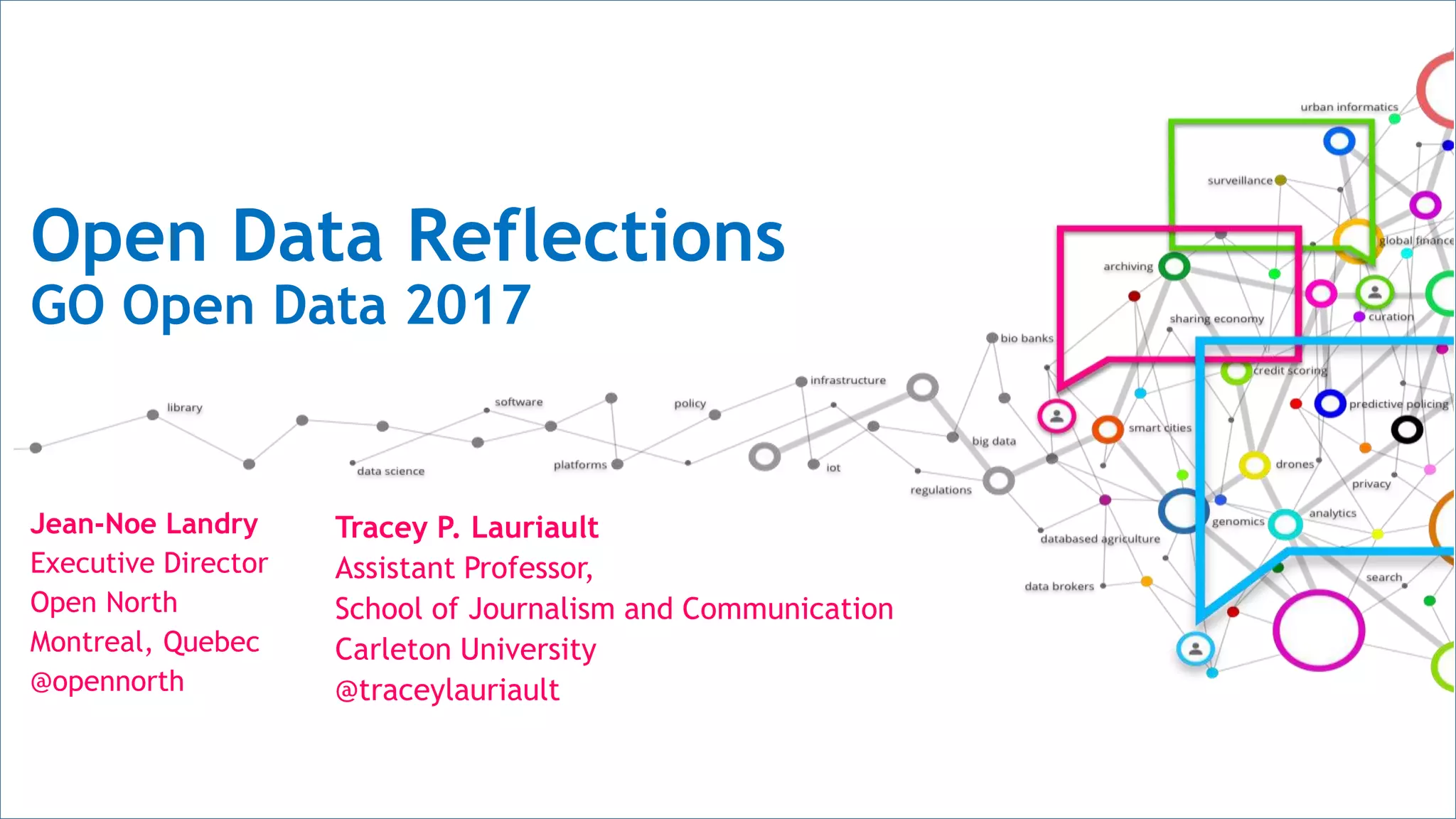 The document outlines key themes in open data, emphasizing the importance of data smart communities, data poverty, and data sovereignty. It discusses the need for human-centered approaches to data collection and the involvement of First Nations in defining data sovereignty. Open North aims to build robust open data ecosystems through collaboration, critical reflection, and a holistic understanding of data's impact on communities.