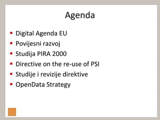 Dokument raspravlja o strategiji otvorenih podataka u EU, koja uključuje mjere za poticanje gospodarskog rasta kroz ponovno korištenje javnih podataka, uz naglasak na transparentnost i ravnopravne tržišne uvjete. Ističe se ekonomski potencijal javnog sektora i prepreke u implementaciji, kao što su strah od otvaranja podataka i pravne nejasnoće. Također se naglašava važnost pravnih okvira koji bi omogućili efikasnije korištenje javnih podataka radi stvaranja novih poslovnih prilika i radnih mjesta.