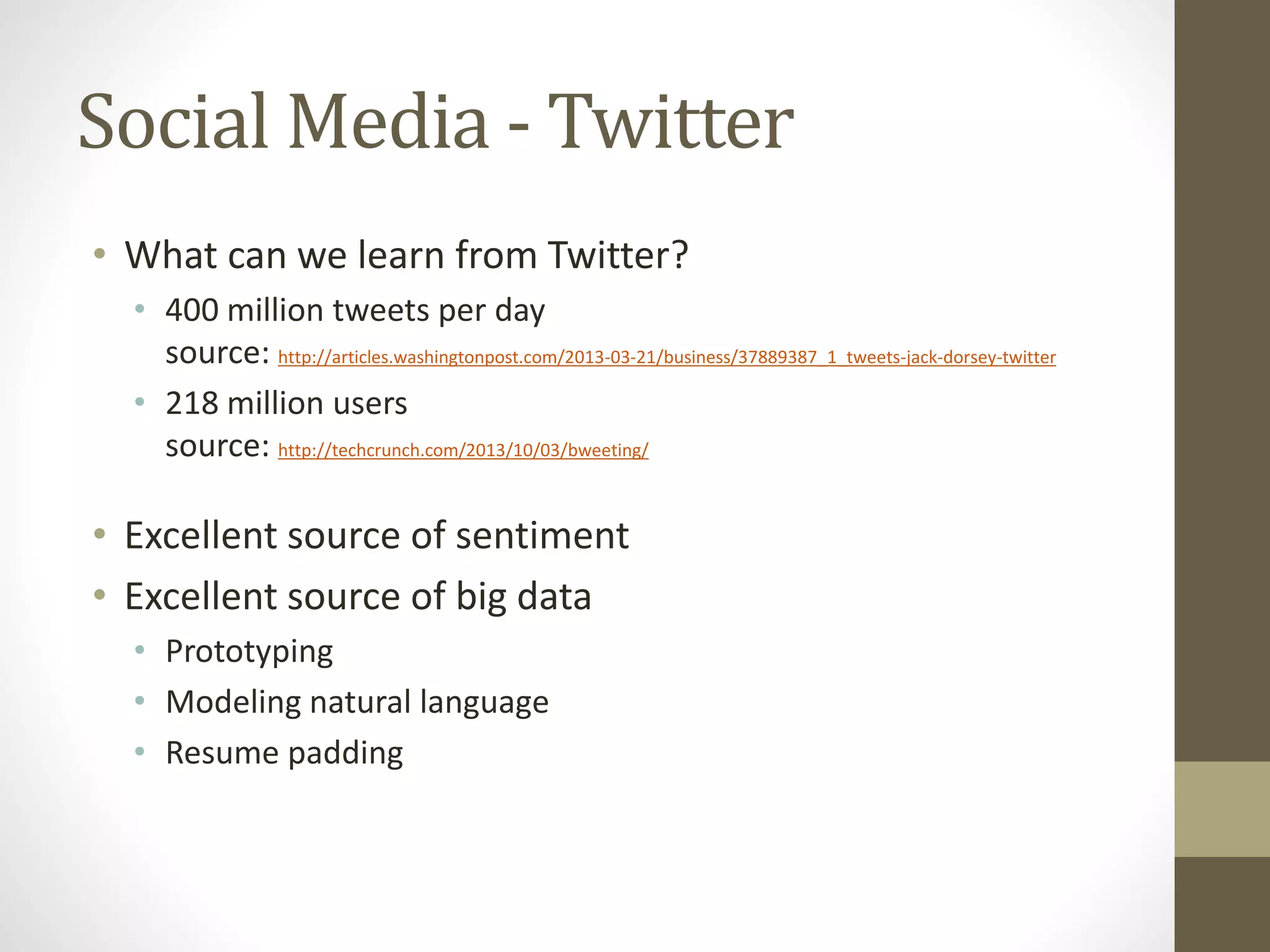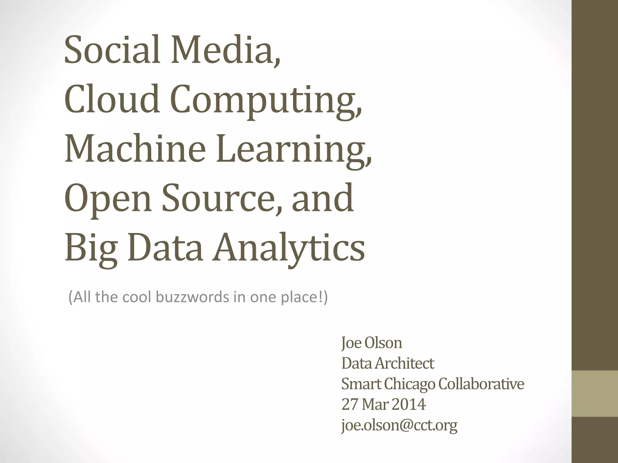 This document discusses using social media, cloud computing, machine learning, open source, and big data analytics to analyze Twitter data. It describes how to collect tweets using the Twitter API, classify tweets in real-time using machine learning models on AWS, store classified tweets in MongoDB on AWS, and present results. Cost estimates for real-time classification of 1 million tweets per day are provided. Use cases described include tracking food poisoning reports and disease occurrence. Future directions discussed include developing turnkey services and linking to additional open data sources.
