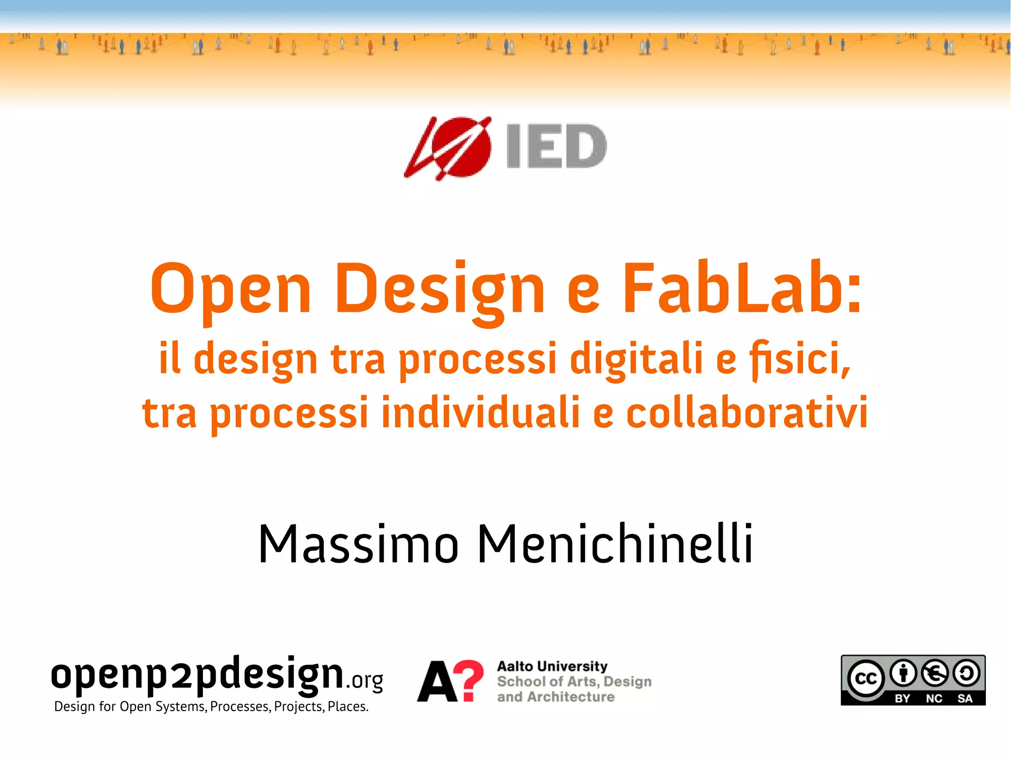 Il documento esplora la relazione tra design aperto e fablab, evidenziando l'interazione tra processi digitali e fisici, nonché tra approcci individuali e collaborativi. Viene esaminata la democratizzazione della fabbricazione e l'importanza delle comunità locali e globali nel contesto dei fablab. Inoltre, si discute il futuro del design aperto come sistema sociale e produttivo, richiamando l'attenzione sulla sostenibilità e l'innovazione degli utenti.