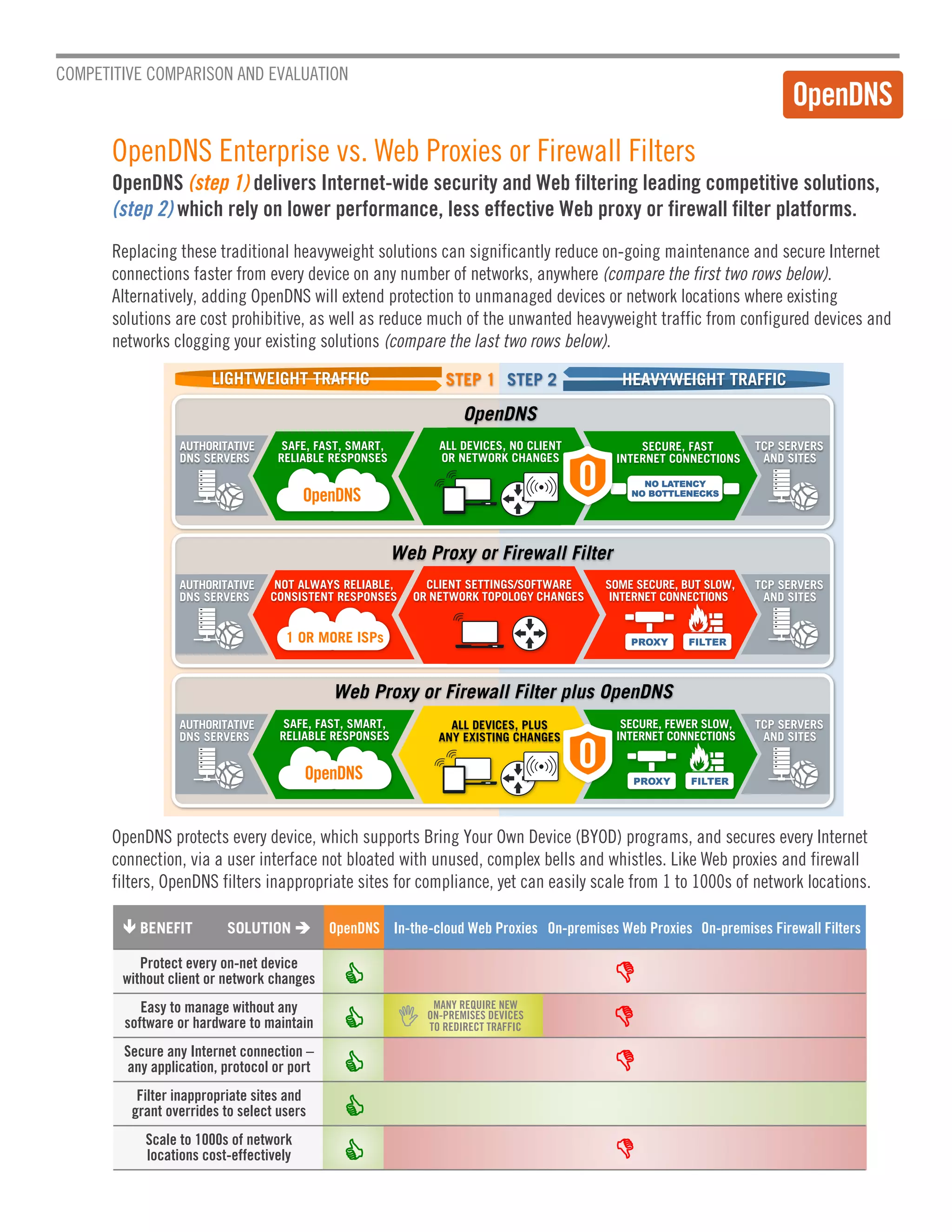 Many security vendors focus on efficacy but overlook usability and performance. OpenDNS delivers internet-wide security and filtering through lightweight DNS redirection without network changes, making it easy to provision, enforce policies, and manage across many locations. Alternatively, web proxies and firewalls rely on heavier traffic redirection and often require new appliances, client settings, and network topology changes per site, increasing maintenance costs and potentially reducing performance.