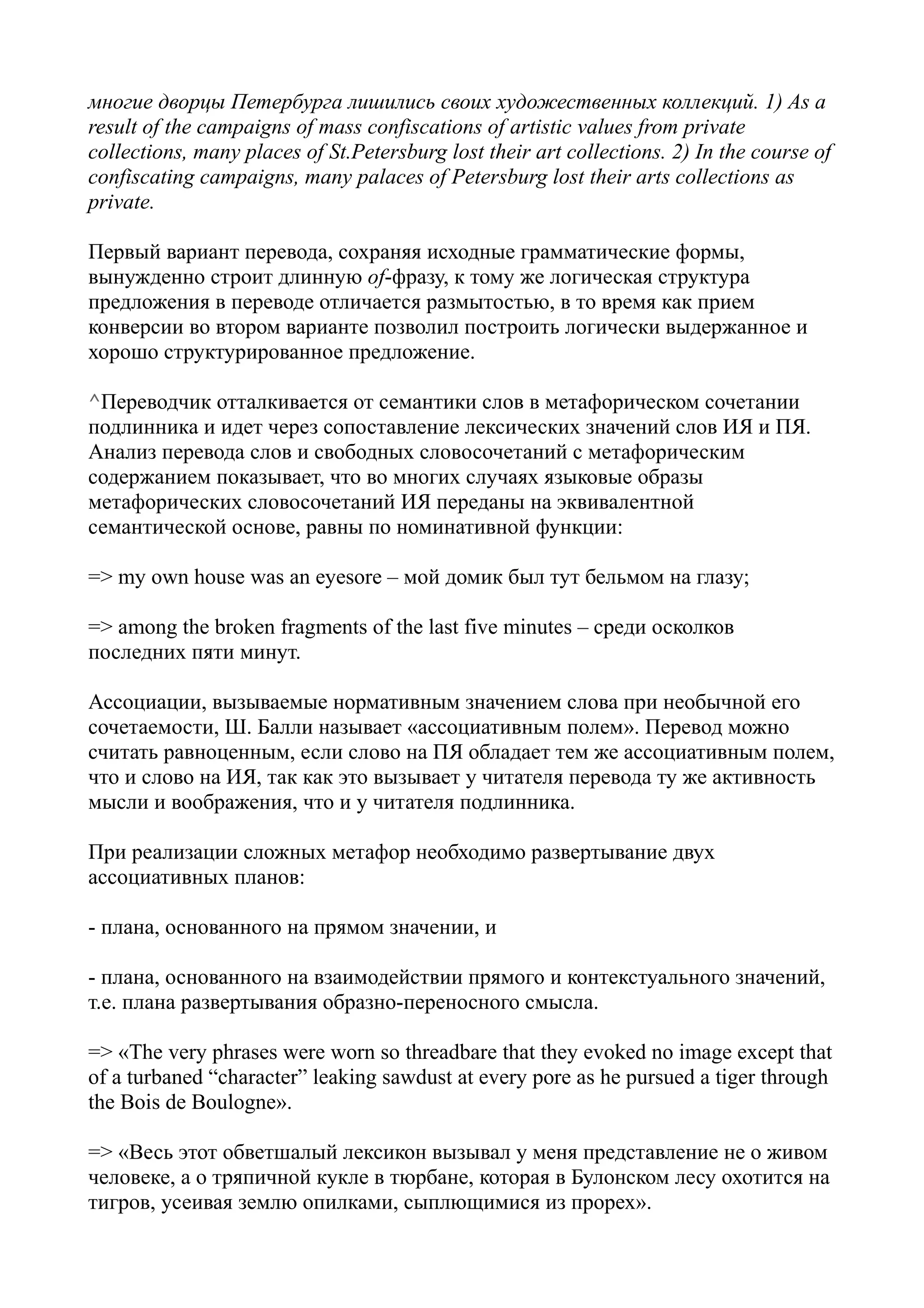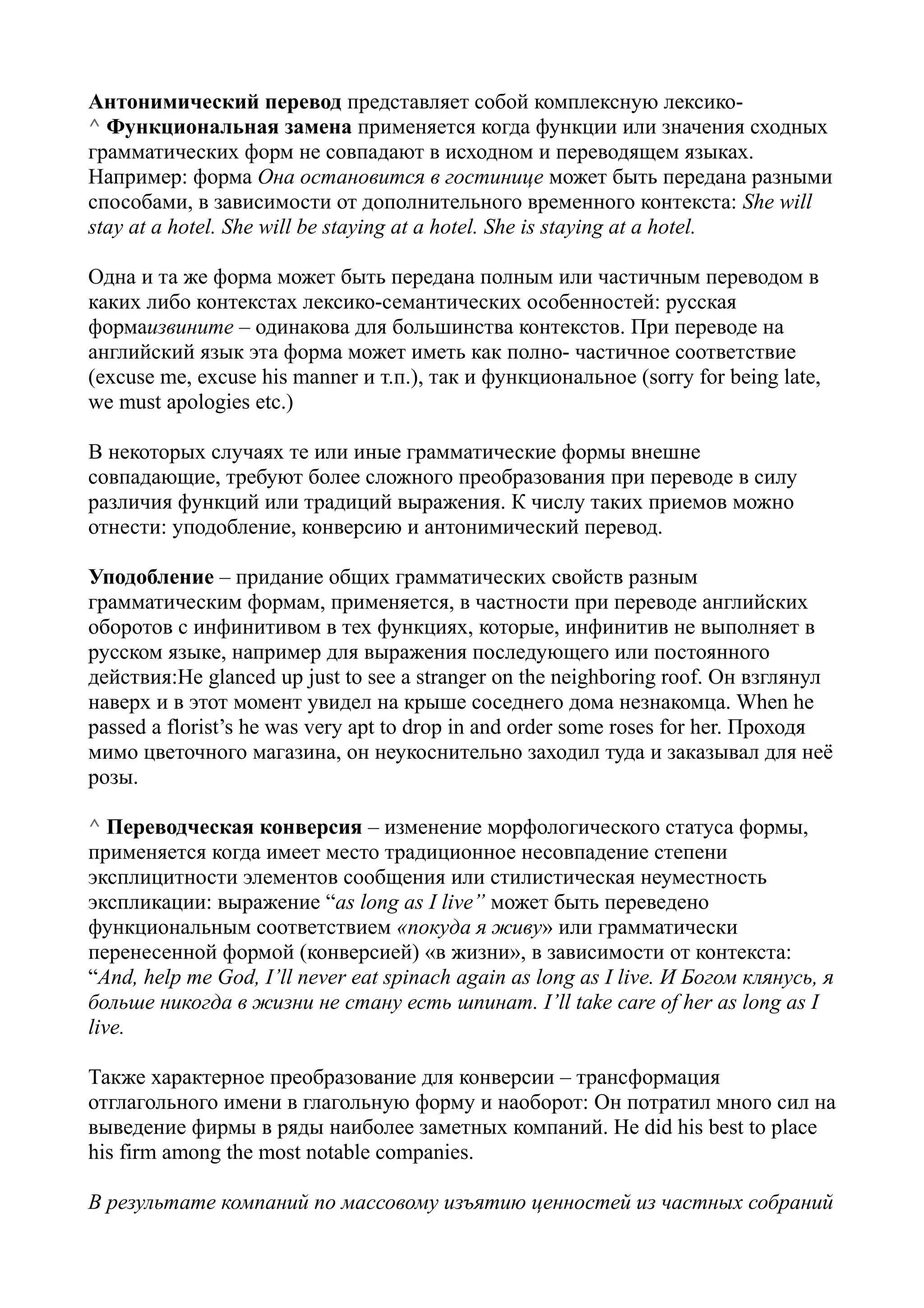 Документ обсуждает антонимический перевод, который представляет собой лексико-функциональную замену в случае несоответствия грамматических форм и значений в языках. Приводятся примеры различных приемов перевода, таких как уподобление, конверсия, и метонимия, а также описываются проблемы, возникающие при переводе метафорических и метонимических выражений. Основное внимание уделяется различиям в грамматических структурах и как они могут быть преодолены в процессе перевода, чтобы сохранить выразительность и точность текста.