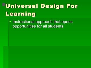 Universal Design for Learning (UDL) is an instructional approach that provides flexibility in how students access and engage with content in order to maximize opportunities for all students to learn. UDL builds flexibility into curriculum by providing multiple means of representation, expression, and engagement. It draws from principles of inclusive design and recognizes that there is variability in how all people learn based on their individual brains and experiences. UDL supports learning by providing options that address recognition networks, strategic networks, and affective networks.
