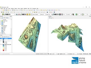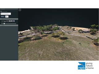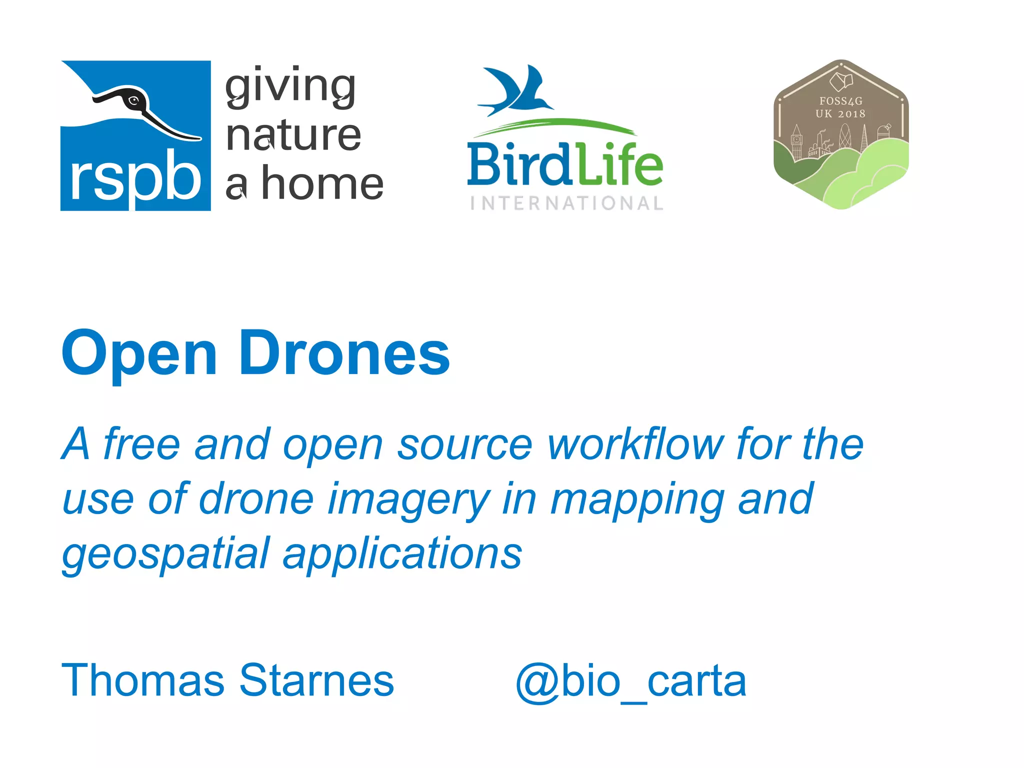 This document outlines an open source workflow for using drone imagery in mapping and geospatial applications. The workflow involves complying with laws, following best practices, configuring drone settings, planning missions, flying the drone, processing imagery, quality checking, and ground truthing. Products of the workflow include imagery, 3D models, point clouds, orthomosaics, and vegetation indexes. Applications include visualization, surveys, land cover analysis, vegetation analysis, habitat studies, agriculture, hydrology, and publicity. The document concludes some challenges exist with georectification and more experimentation is needed with flight parameters, image processing techniques, and comparison to LiDAR.