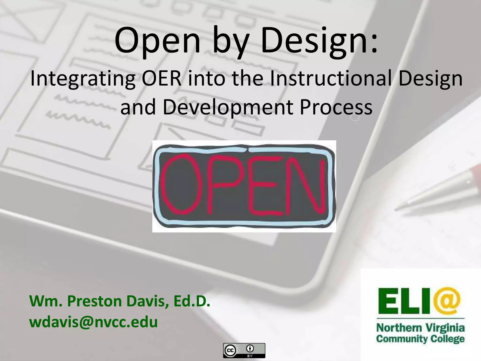 This document discusses integrating open educational resources (OER) into the instructional design and development process. It outlines Quality Matters standards for course design and NOVA's process for designing online courses that meet these standards. This includes selecting OER instructional materials, creating a course map, building the course in Blackboard, reviewing the course, and preparing it to go live. NOVA has developed over 40 online courses and two associate degree tracks using only free OER materials, saving students over $1.5 million in textbook costs.
