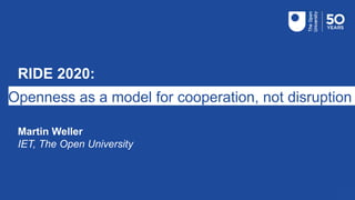 1. The document discusses openness as an alternative model to disruption in higher education. It argues that open practice is not about disrupting higher education, but providing an alternative cooperative model.