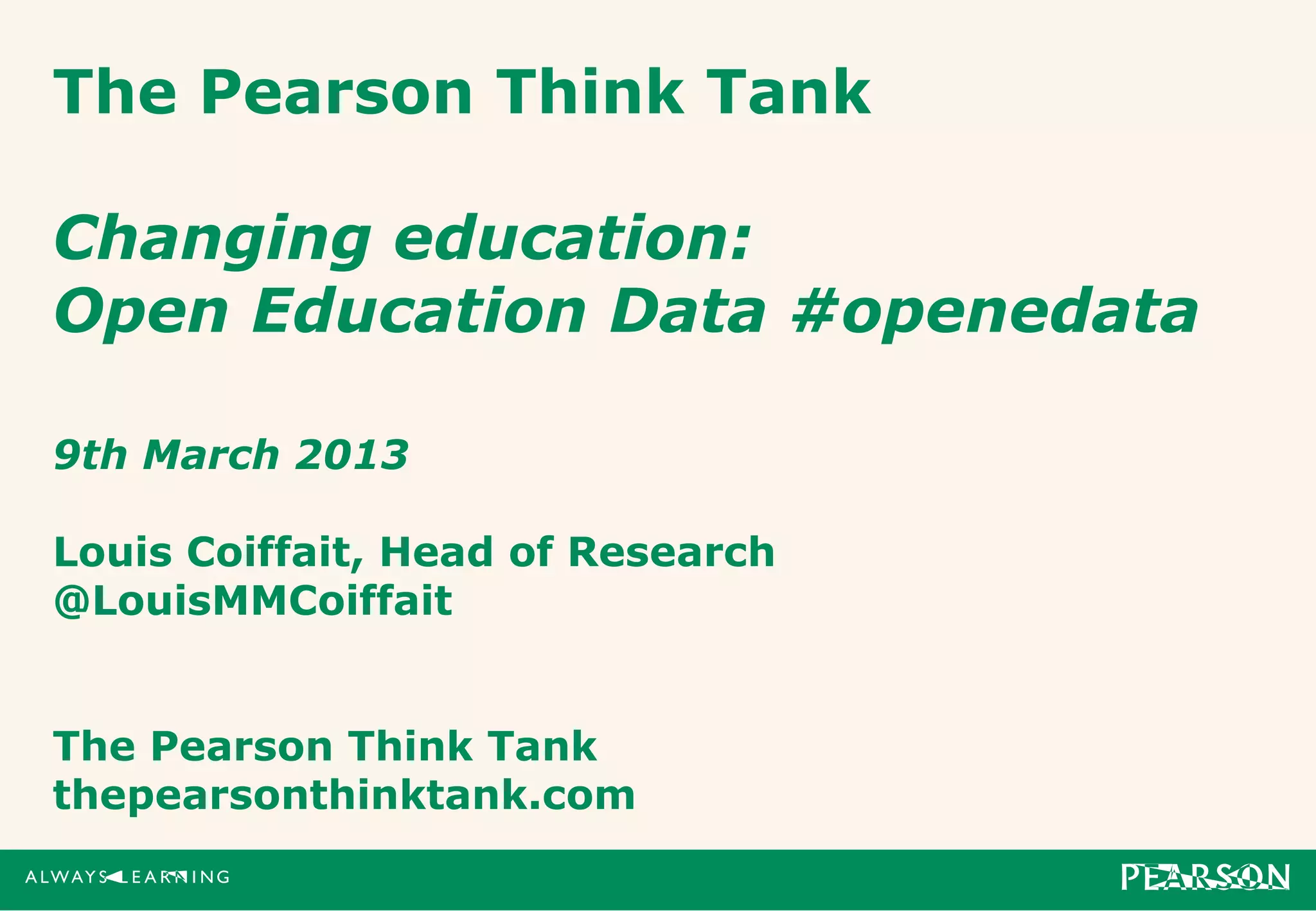 The document discusses open education data and outlines the Pearson Think Tank's work in this area. It defines open education data and notes its increasing use for accountability purposes. However, awareness and strategy around using this data for innovation and efficiency is still low. The Think Tank plans to further explore key questions on open data, barriers to its use, and next steps including an event, research, and hack day to engage stakeholders and develop applications.