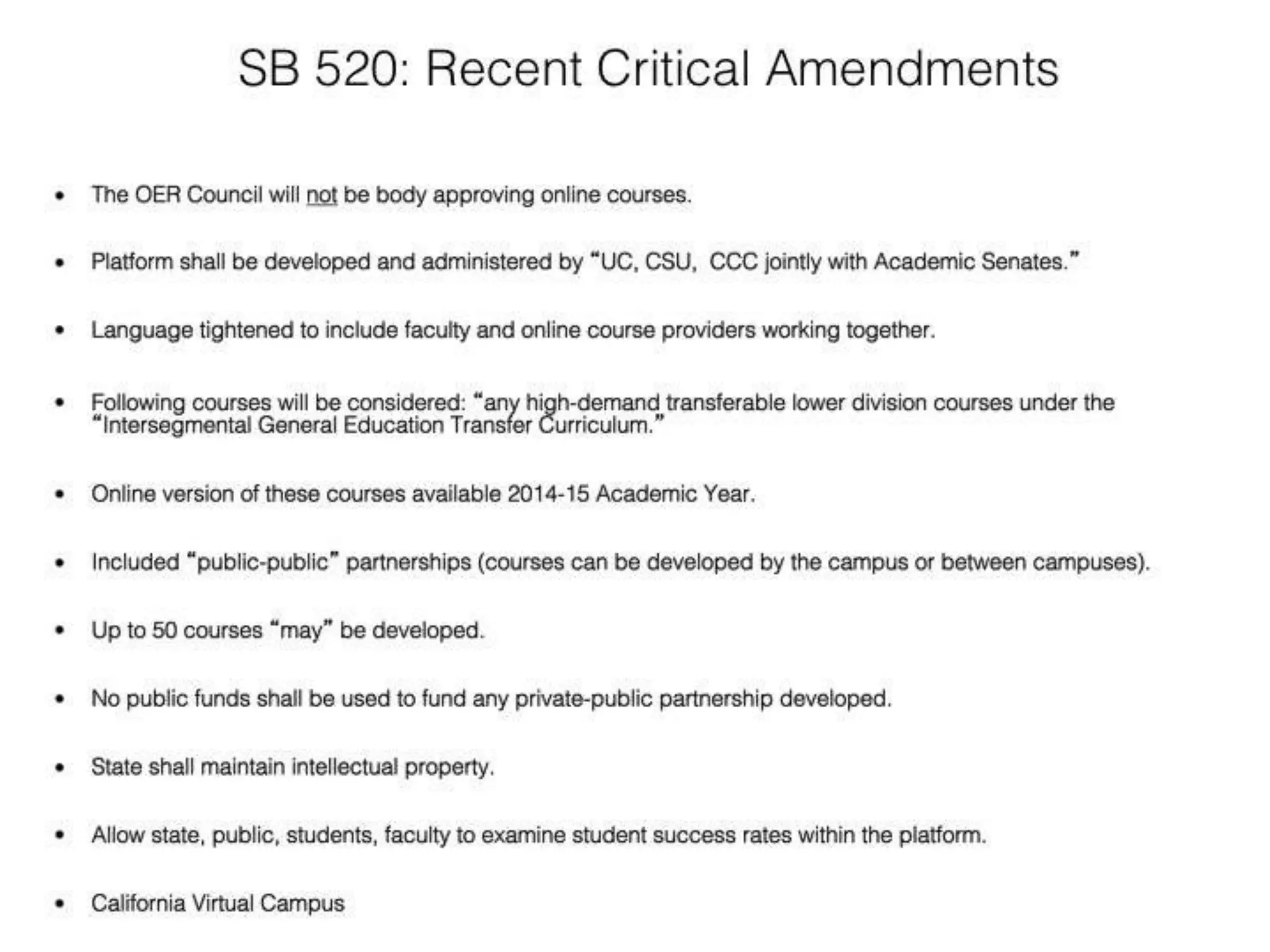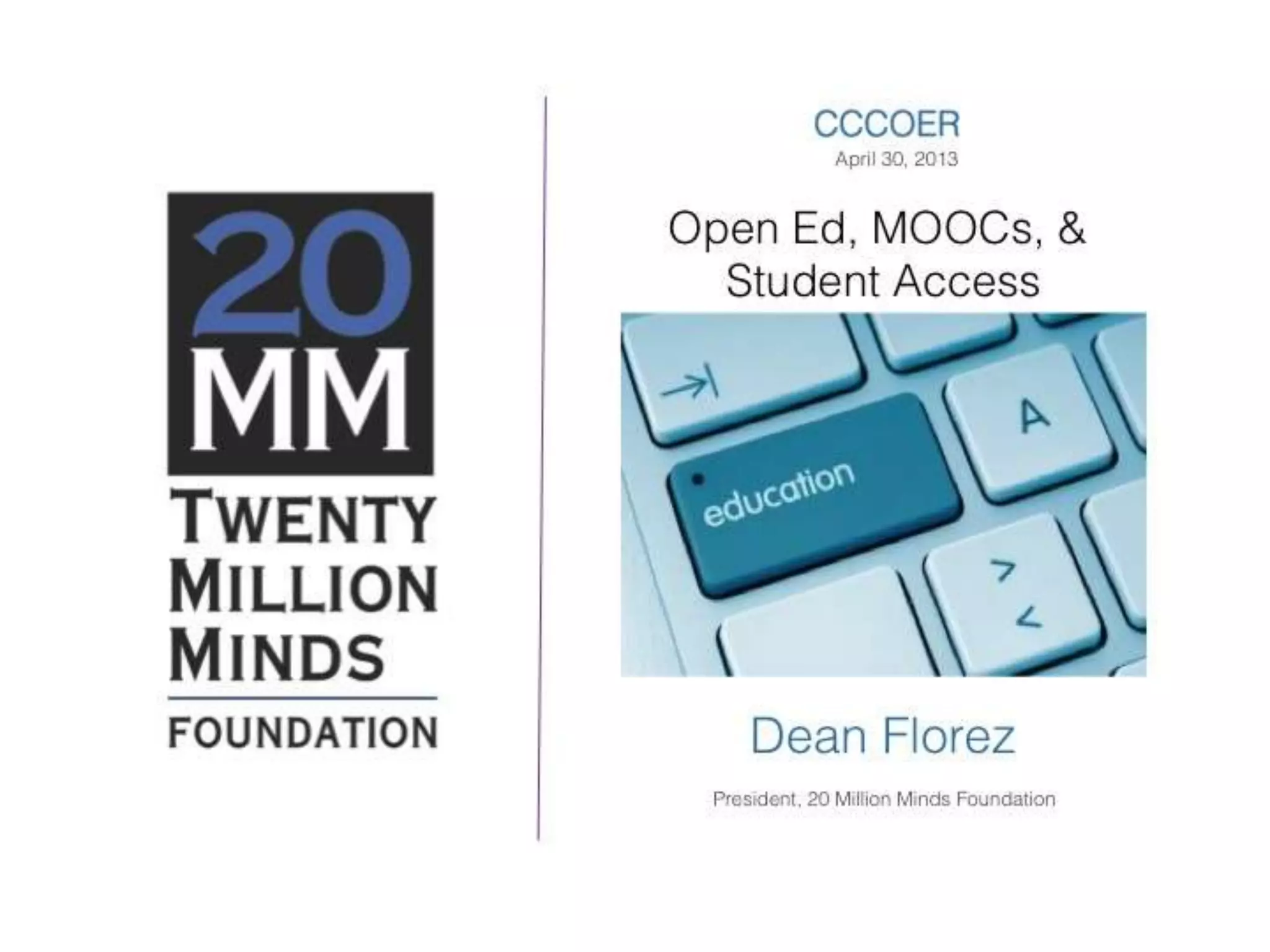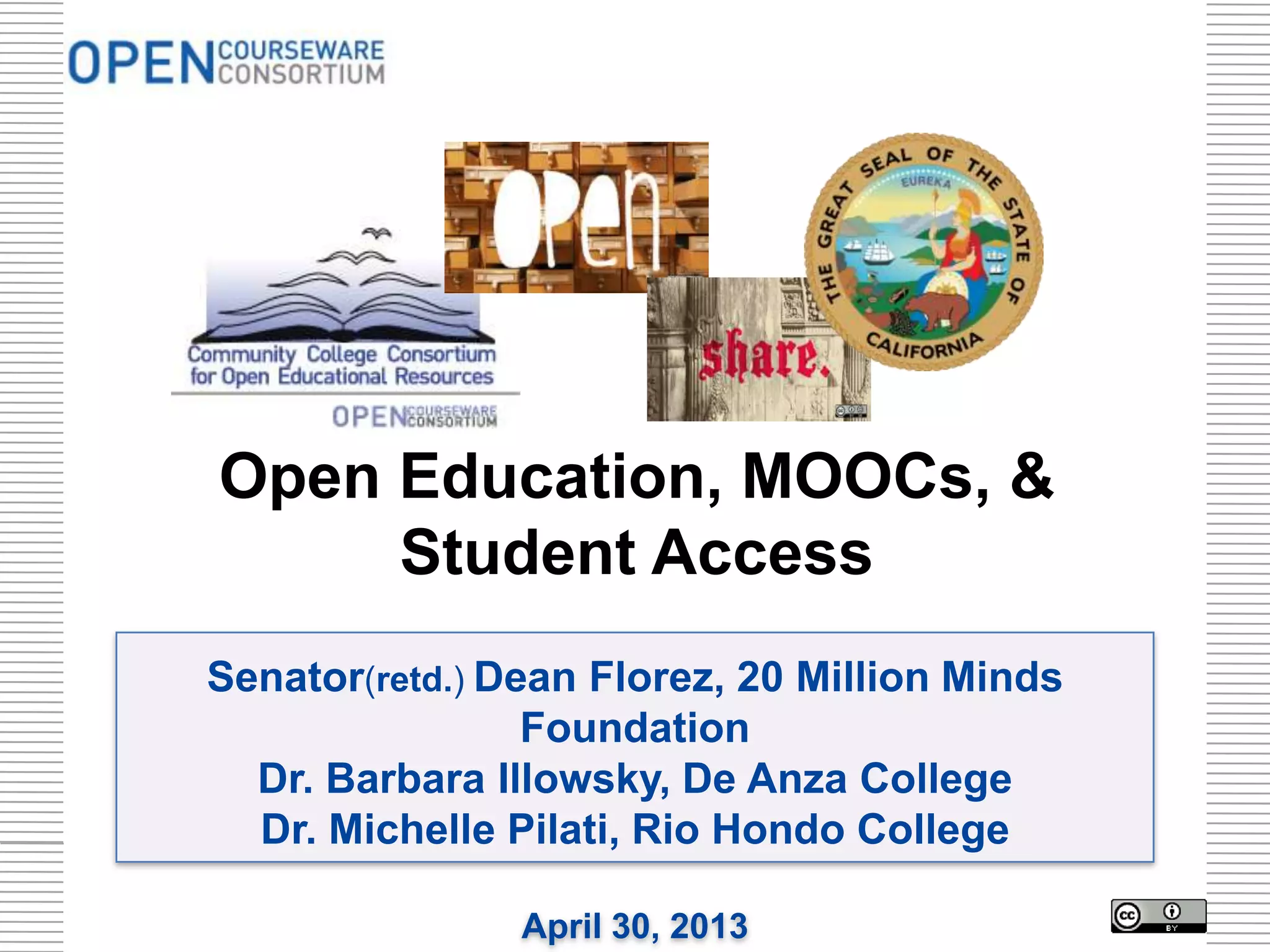 This webinar discussed open education, MOOCs, and student access in California community colleges. It covered Senate bills 1052 and 1053 which establish an open education resources library and council. Speakers discussed increasing student success and access through open educational resources, MOOCs, and competency-based learning. Concerns were raised about ensuring equal access to technology and success in online courses. MOOCs were viewed as a potential way to increase access if they increase student success rates. Developing high-quality, community college MOOOs was suggested as a way to capture effective teaching practices and make materials widely available.