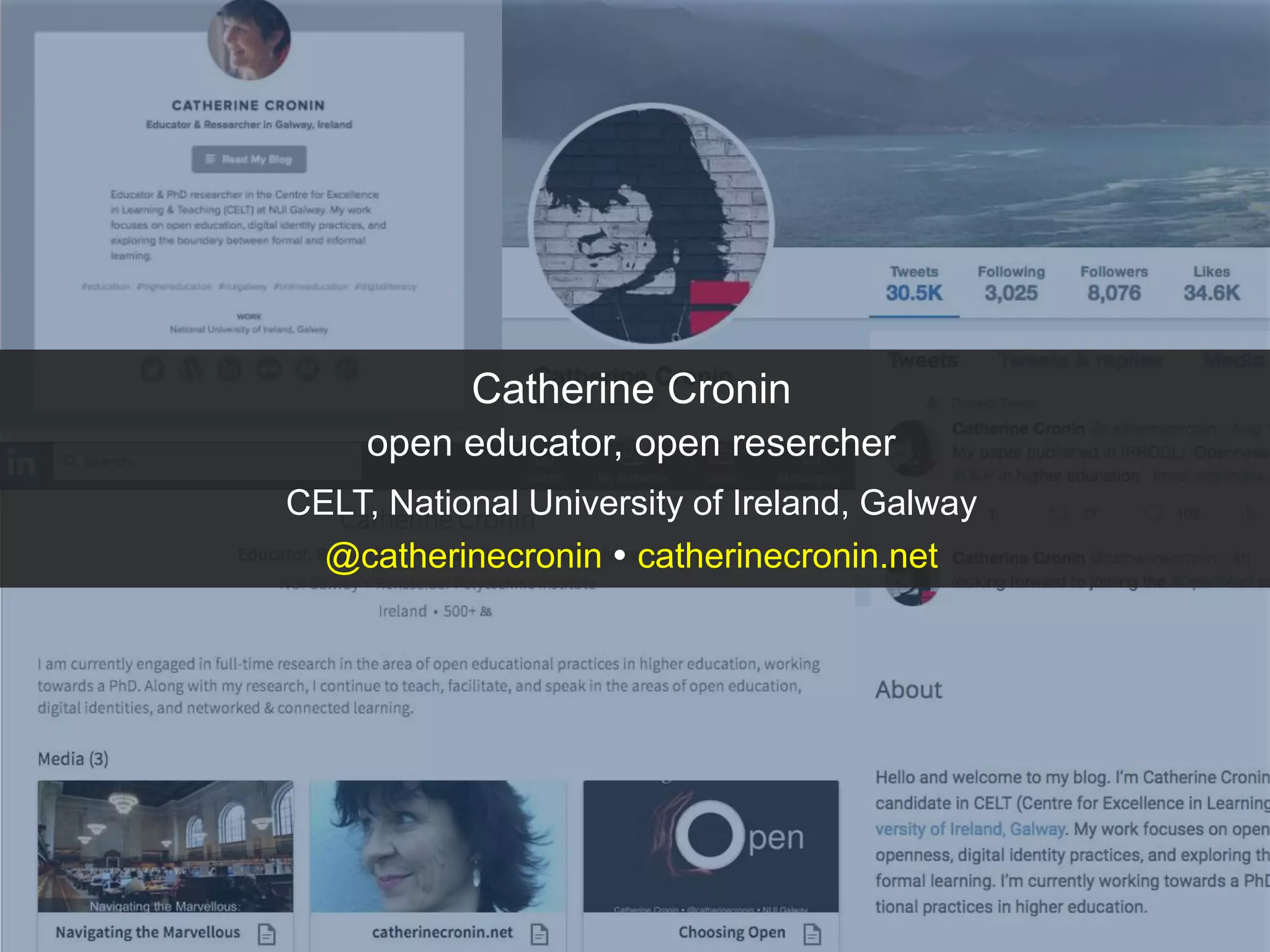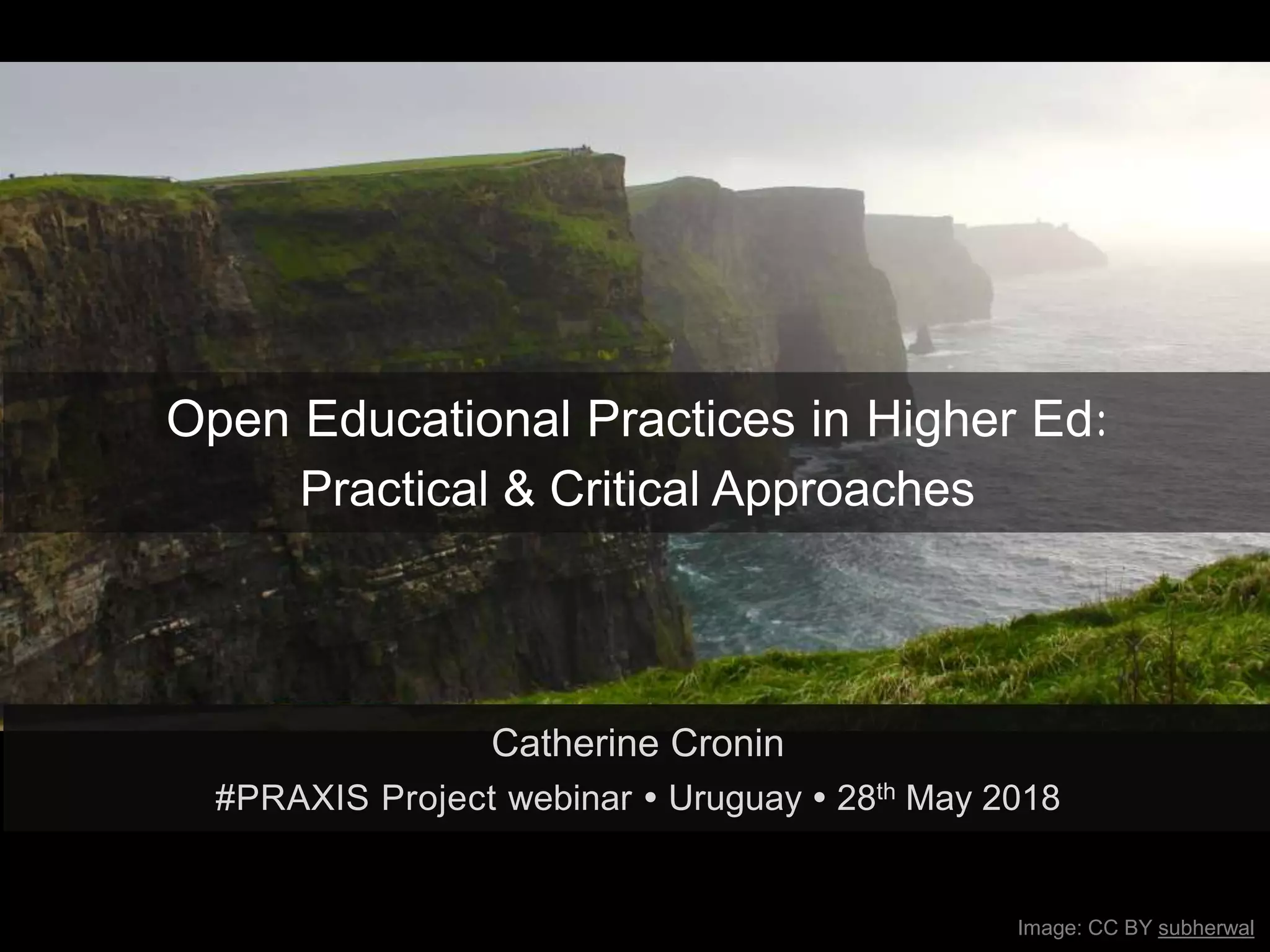 Catherine Cronin presented on open educational practices in higher education. She discussed how use of open practices like open educational resources and collaborative technologies is complex and personal for educators. While there are potential benefits like increased access and developing new literacies, there are also barriers like lack of skills, support, and incompatibility with existing institutional cultures. Cronin's research found educators who choose to use open practices balance privacy and openness, develop digital literacies, value social learning, and challenge traditional teaching roles. Overall, open practice adoption is continually negotiated based on the specific context and individual.