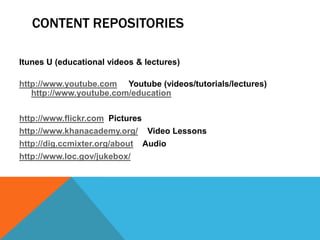 This document lists various open educational resource (OER) and reusable learning object (RLO) repositories that contain searchable and interlinked educational content. It provides URLs to repositories such as Merlot, OER Commons, and Connexions that contain lessons, activities and other learning objects. It also lists repositories for multimedia content including videos, pictures, audio and interactive tools that can be used or reused in teaching. The document suggests ways these open resources can be shared and used, and provides additional online resource links.