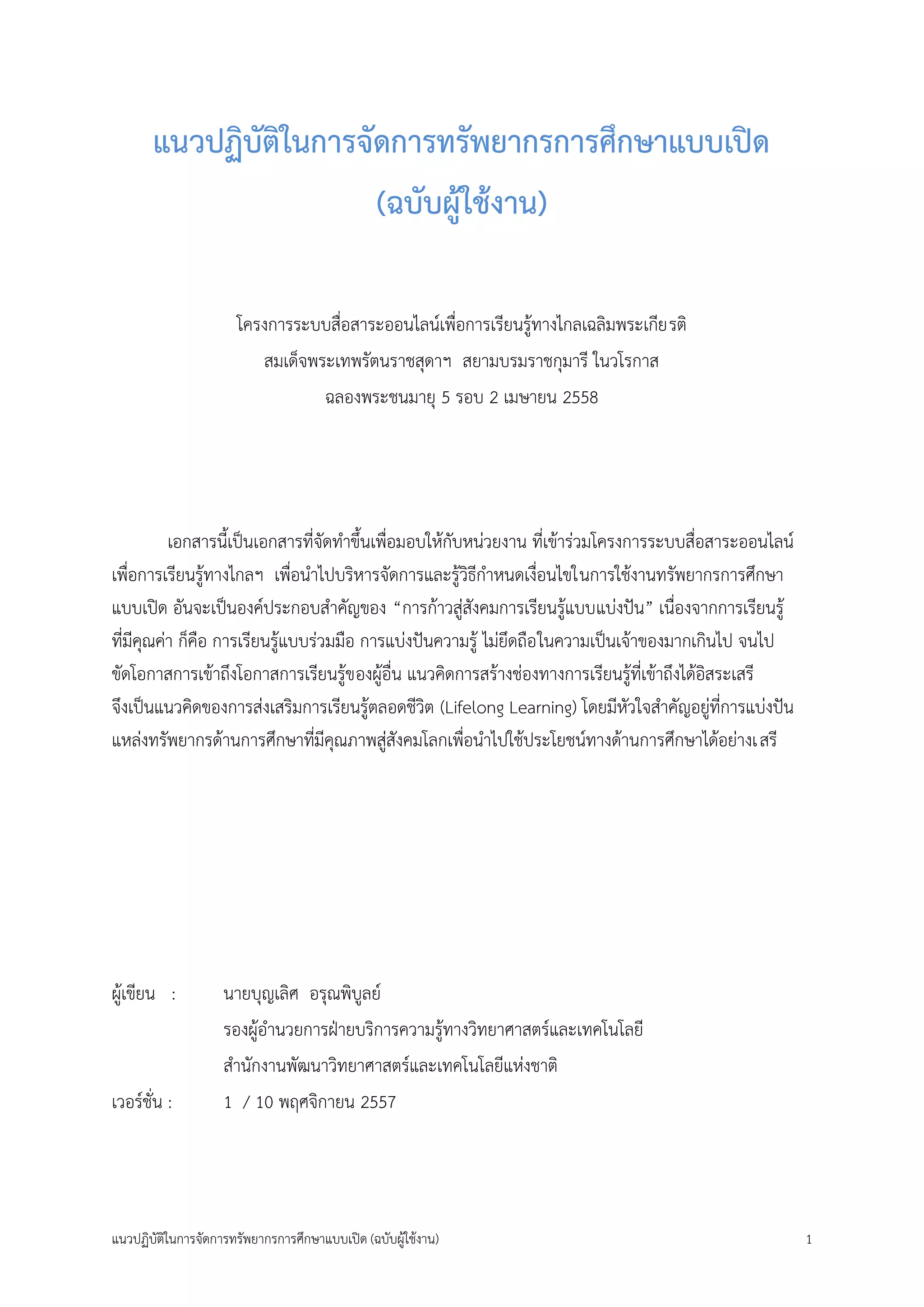 แนวปฏิบัติในการจัดการทรัพยากรการศึกษาแบบเปิด (ฉบับผู้ใช้งาน) ในโครงการระบบสื่อสาระออนไลน์เพื่อการเรียนรู้ทางไกลเฉลิมพระเกียรติสมเด็จพระเทพรัตนราชสุดาฯ สยามบรมราชกุมารี ในวโรกาส ฉลองพระชนมายุ 5 รอบ 2 เมษายน 2558