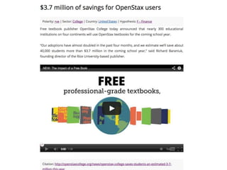 Dr. Robert Farrow presents the Open Educational Resources (OER) Research Hub project, which aims to comprehensively assess the impact of OER across various educational sectors. Funded by the Hewlett Foundation, the initiative employs collaborative research and aims to support evidence-based decision-making in education. Key research hypotheses focus on performance, access, retention, and adoption of OER, while encouraging engagement and feedback from the community.