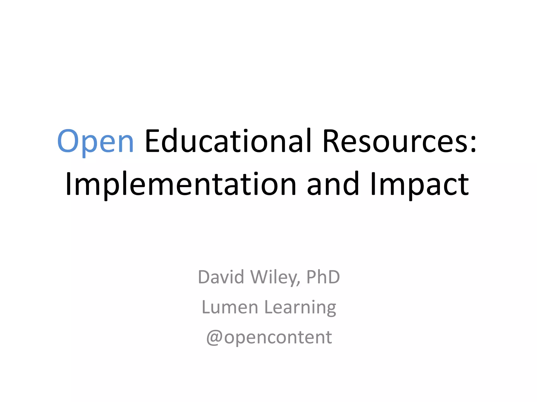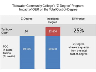 The document discusses the implementation and impact of open educational resources (OER), emphasizing their role in improving affordability, pedagogy, and student success. It highlights the 5Rs of OER—retain, reuse, revise, remix, and redistribute—and provides statistical insights into the benefits of OER over traditional textbooks. The presentation calls for the strategic support and investment necessary for scaling OER initiatives in educational institutions.