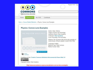 This document provides information on open educational resources (OER) projects and where to find course materials. It lists types of OER which include courses, course materials, content modules, learning objects, collections, and journals. It then lists numerous OER initiatives and repositories from countries around the world, including OER Africa, the OpenCourseWare Consortium, initiatives from Indonesia, India, Thailand, Pakistan, Sri Lanka, and more. It encourages joining the OER Foundation and becoming a member of WikiEducator.