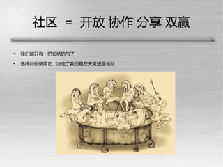 该文档讨论了 opnerp 中国社区的培养与发展,强调开放、协作与分享的社区价值。它指出了翻译、文档、交流与模块开发的成果及对用户的支持。文中提到,尽管 qq 群促进了交流,但也存在挑战,微博和博客在推广中各有利弊。