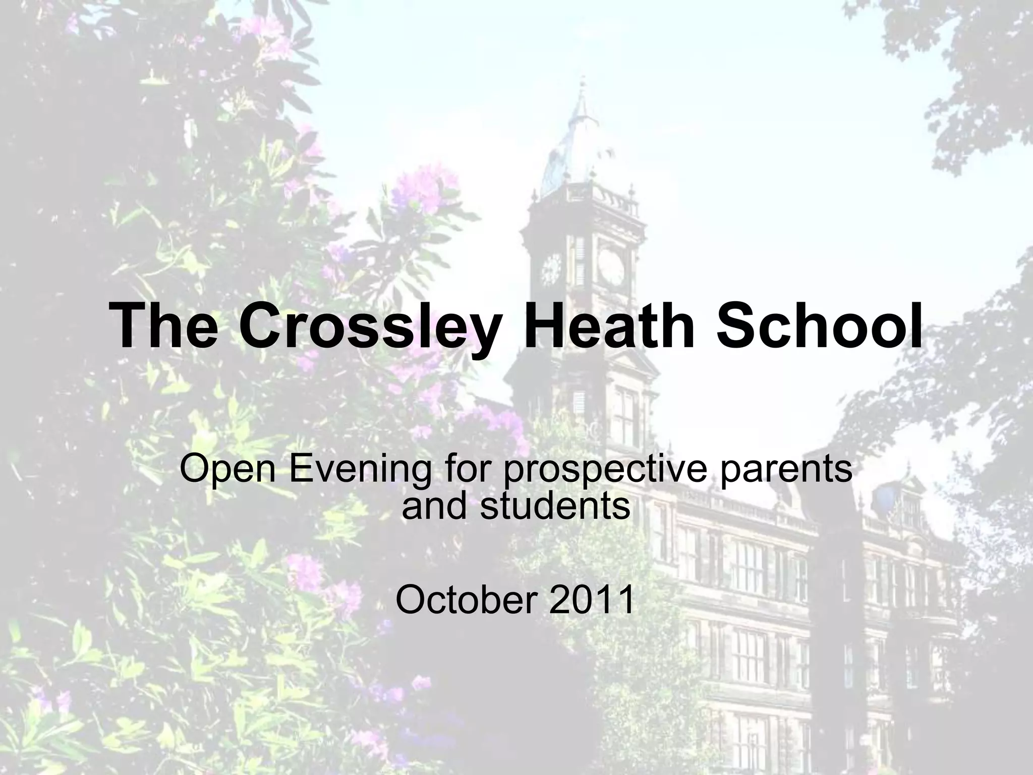 The document summarizes an open evening event at The Crossley Heath School. It introduces the school staff and provides an overview of the school's academics, extracurricular opportunities, facilities, admissions process, and goals of developing well-rounded students. Refreshments were available and attendees could learn about the school directly from staff, students, and governors.