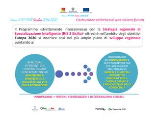 Il documento descrive la programmazione dei fondi strutturali per la Sicilia per il periodo 2014-2020, evidenziando l'importanza della collaborazione tra amministratori, cittadini e partner per sviluppare una strategia regionale. Le cinque sfide prioritarie includono il rafforzamento delle misure anticicliche, la competitività economica, la valorizzazione del patrimonio culturale, il miglioramento della qualità della vita e la sostenibilità ambientale. Si sottolineano inoltre la necessità di innovazioni e infrastrutture resilienti per affrontare le vulnerabilità territoriali e i cambiamenti climatici.
