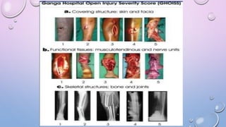 This document discusses the classification of open fractures. It begins with a brief history, noting that open fractures were first recognized by Egyptians and Hippocrates advocated debridement. It then details several classification systems for open fractures. The most widely used system is the Gustilo-Anderson classification, which considers wound size, soft tissue damage, and contamination. Type III fractures are further divided into subclasses A, B, and C based on severity. Other classification systems discussed include MESS, GHOISS, and Oestern and Tschernes. Complications of open fractures include shock, compartment syndrome, and infection.