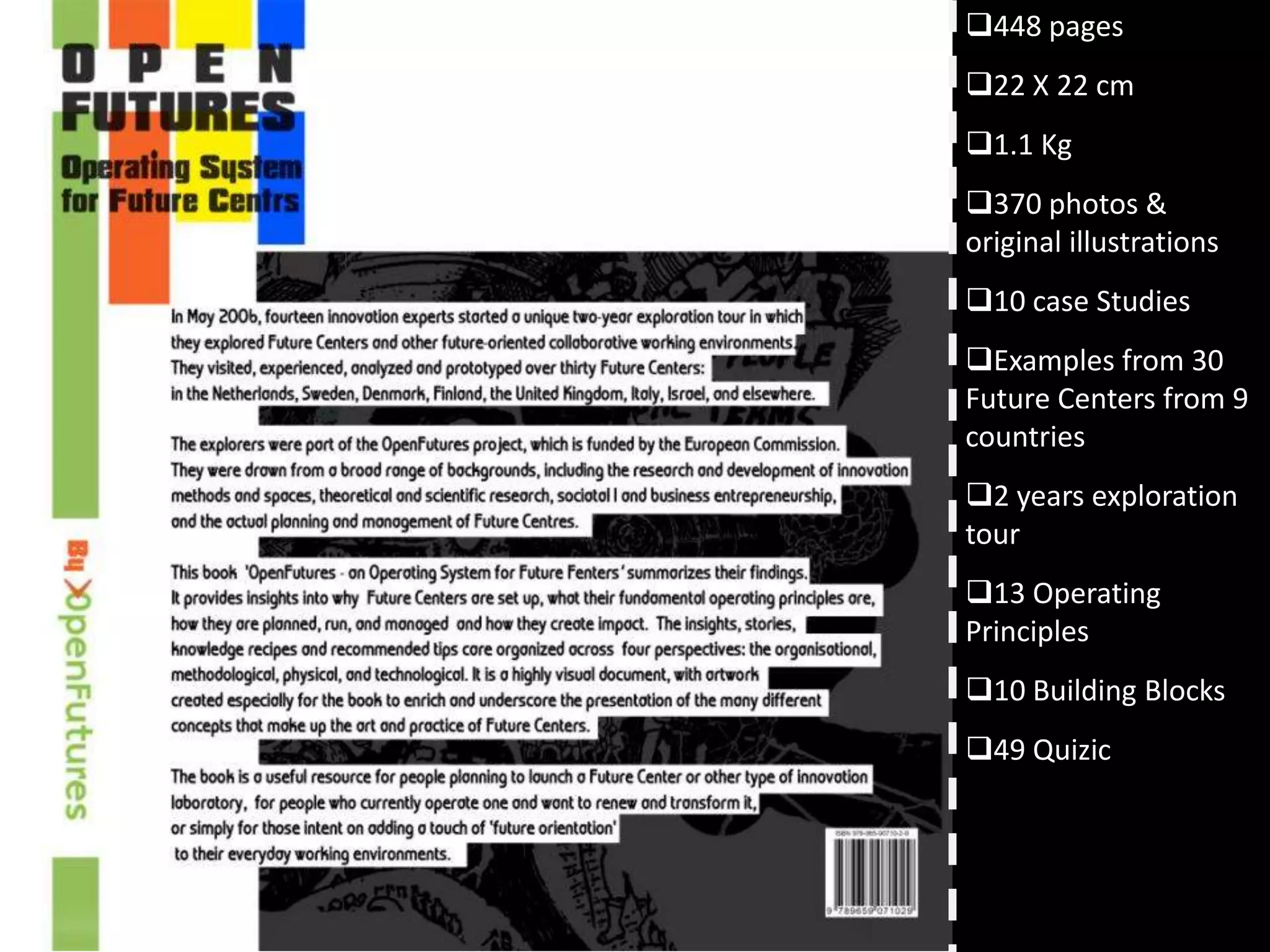 The document is a comprehensive guide about future centers, featuring 370 photos, illustrations, and case studies from nine countries, aimed at fostering innovation. It outlines the operating principles, methodologies, and physical aspects that contribute to the success of these centers. Additionally, it discusses the lifecycle management, business models, and the impact of future centers on organizations and society.