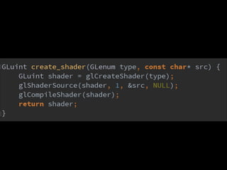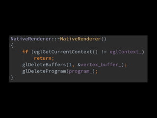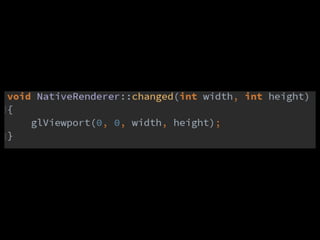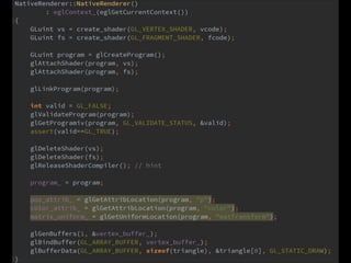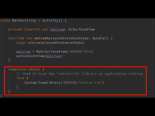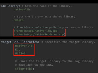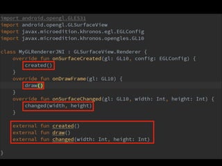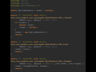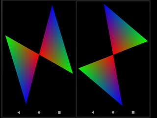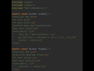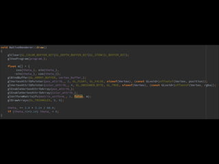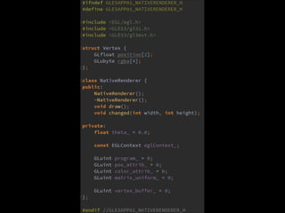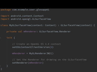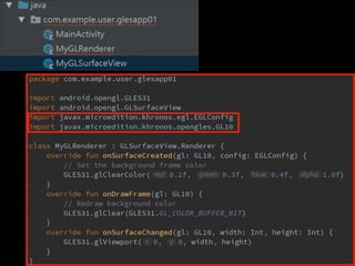 The document discusses OpenGL ES and graphics rendering in Android. It explains the OpenGL family including OpenGL, OpenGL ES, and WebGL. It describes how graphics are rendered in Android using a PhoneWindow, DecorView, SurfaceView, and GLSurfaceView. It provides an example of setting up OpenGL ES 3.1 rendering in Android using GLSurfaceView and discusses key classes and concepts like the renderer, surface, and drawing commands.