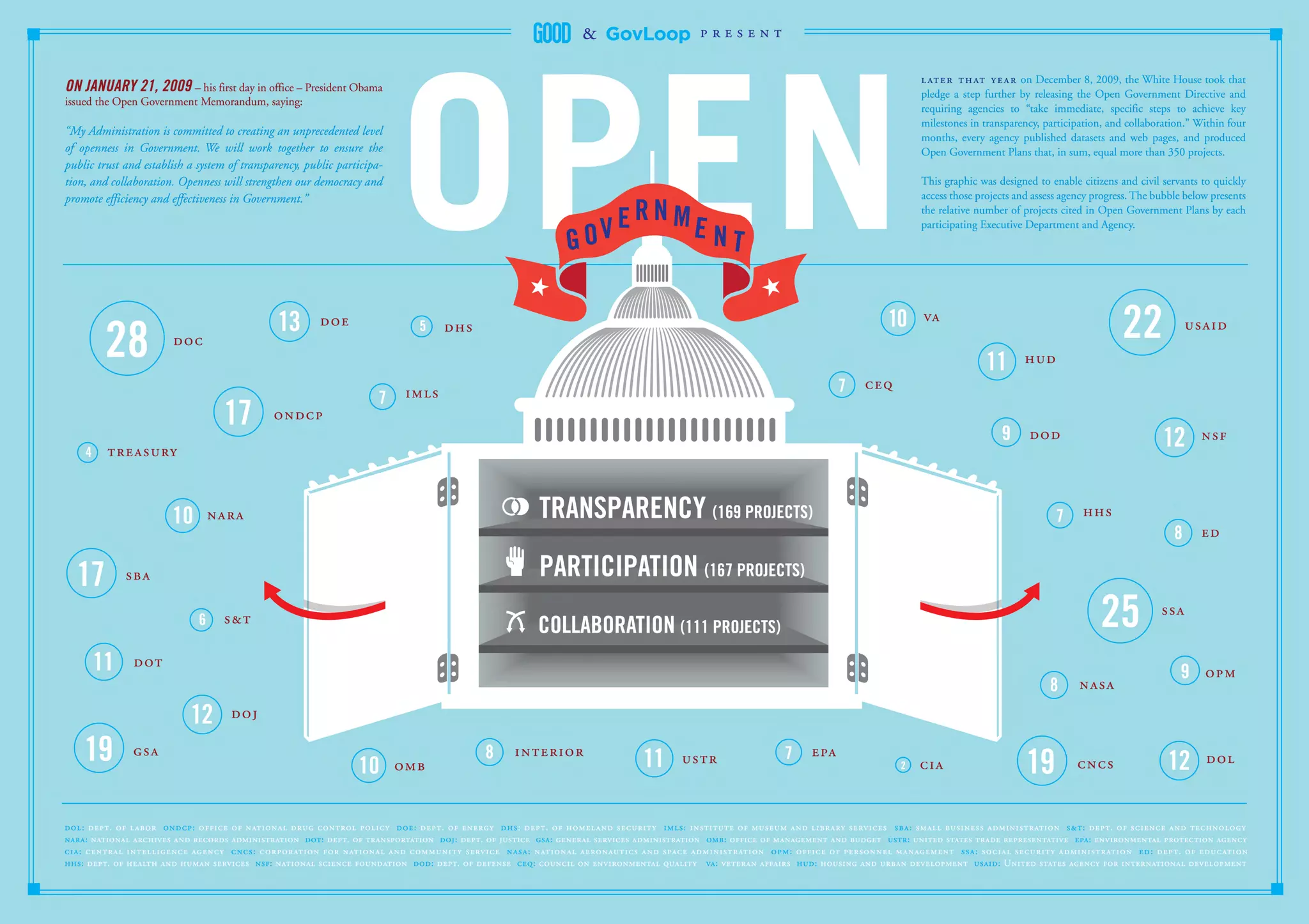 An infograph created in tandem with GOOD, Inc., that makes it easy to find the 350+ Open Government projects named in Federal agency Open Government Plans. Learn more at http://bit.ly/opengovprojects